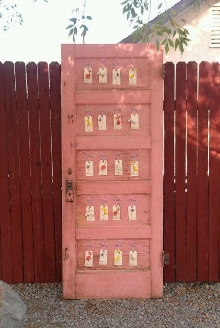 Today’s tutorial is a great way to spice up an antique door and turn it into an escort card chart. This is a great project to for a local or destination wedding that needs a dash of vintage charm as the smaller parts can be assembled at home ahead of time and then just placed on the door when you arrive.