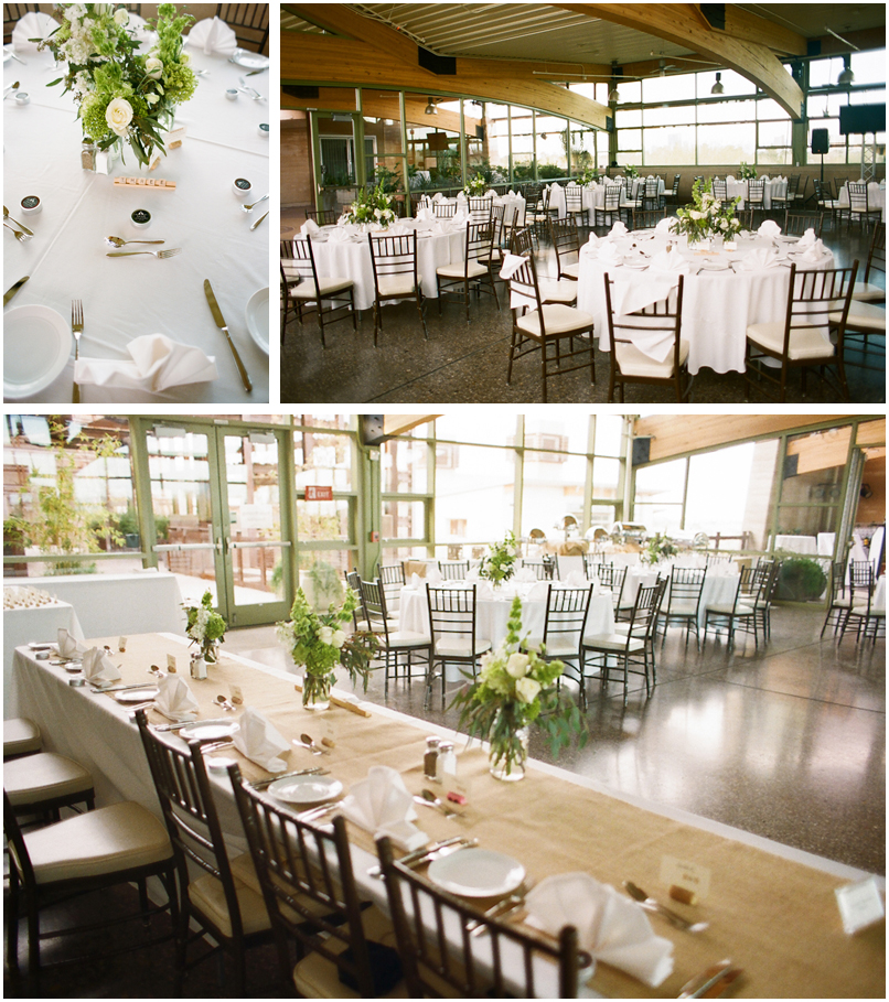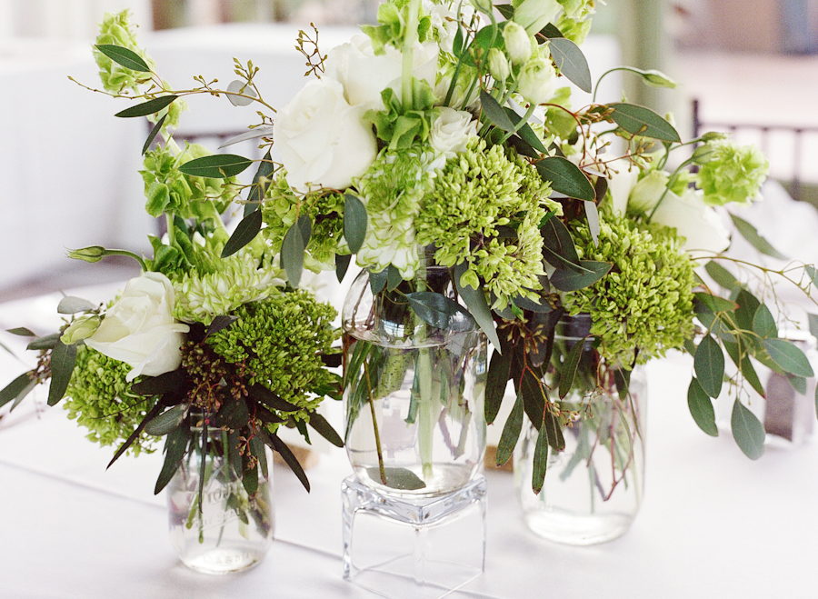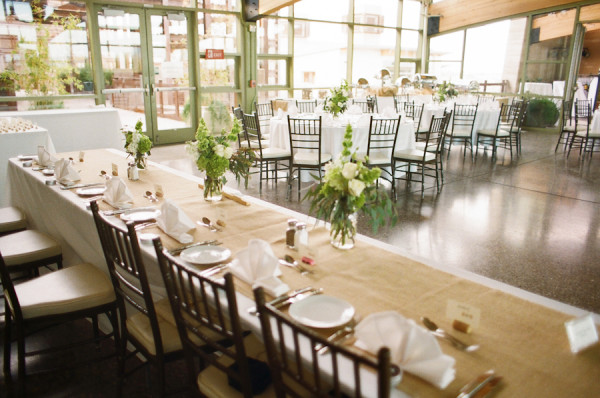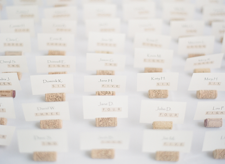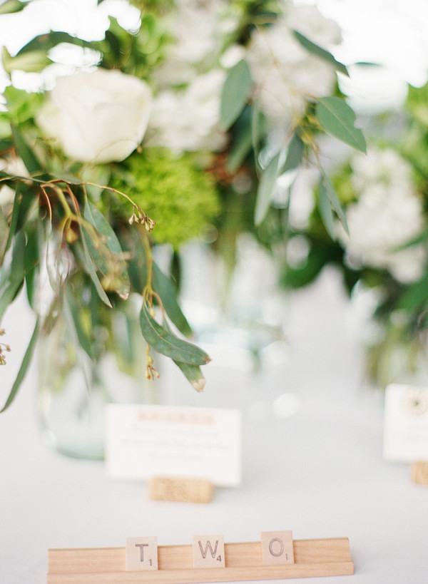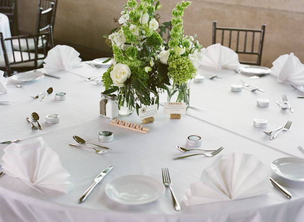Scrabble letters served as table number for guests to find their seats from wine cork escort cards. Burlap linens layered with fresh green and white florals in mason jars took simple rustic elegance to a whole new level on the mix of round and rectangular tables.