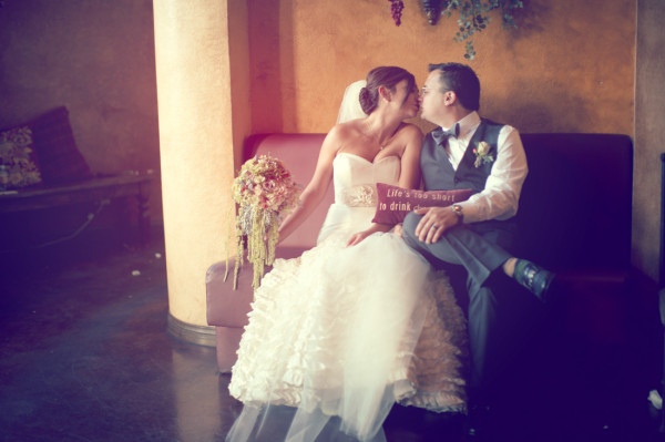 Cami and Patrick – featured in today’s earlier Calico Basin engagement post – chose to hold their fantastic all-in-one wedding ceremony and reception at Sunset & Vines, a restaurant located on the shores of Lake Las Vegas. The event, captured by Gin and Sake Productions, had vintage vinophile vibe with rustic elements that tied together the things most important to the bride and groom – a romantic atmosphere, great food and wine, and family!