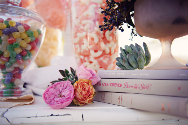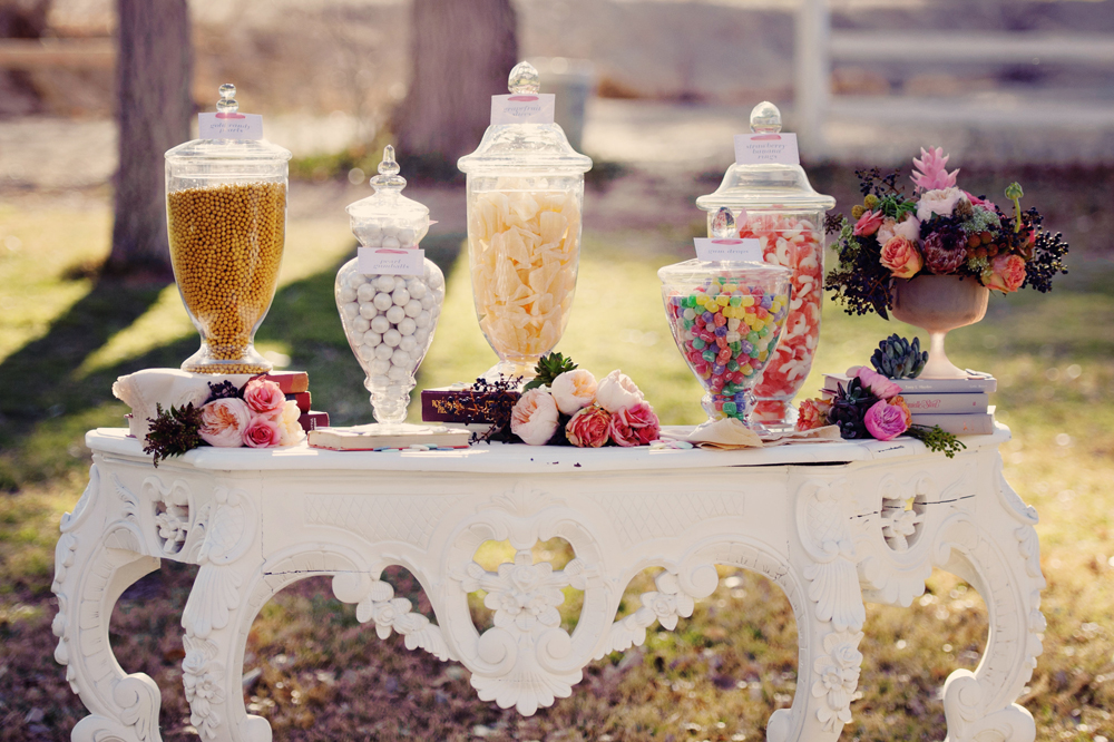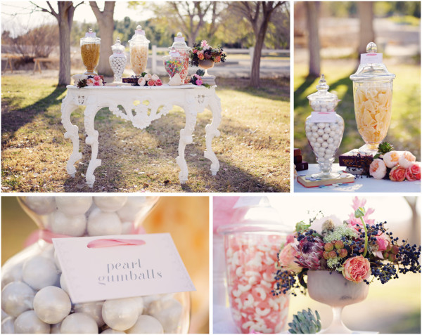Details include dazzling glass apothecary jars displaying sweet treats from B Sweet Candy Boutique, stylish papegoods by Paper & Home and an unforgettable Mina Olive wedding gown.