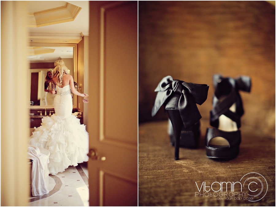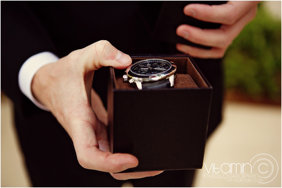 Their day started at the JW Marriott, where everyone got ready. Crissy wore a stunning ruffled Maggie Sottero gown and had her hair and makeup prepped by the ladies of Amelia C & Co. Her daughter got ready with her, donning her own little white tulle tutu. The bride and the groom exchanged gifts the morning of the wedding – Mike receiving a watch from Crissy and Crissy opening a Tiffany necklace. Can you see the card she got? It’s got butterflies on it! I’m sensing a theme here…