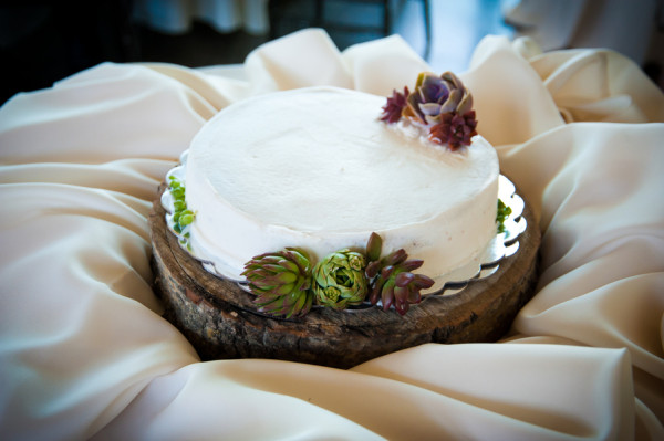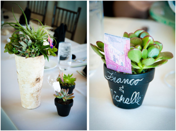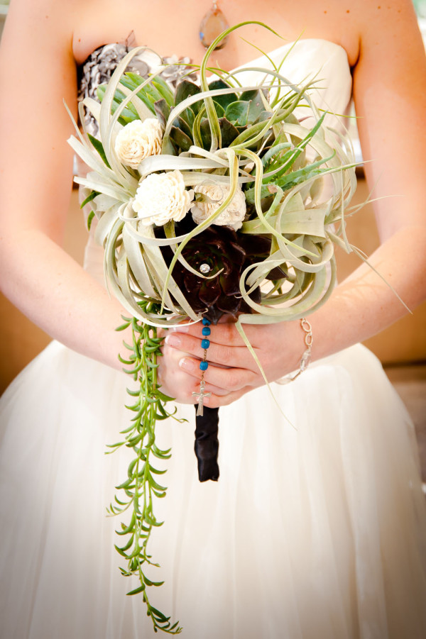 Holding the wedding and reception in the afternoon instead of the evening limited the need for extra lighting. Avoiding traditional and not-so-green cut flowers, Heather instead held a bouquet of succulents and tillandsia. As favors, wedding guests took home the similarly designed centerpieces as well as home baked goodies in compostable cellophane bags.