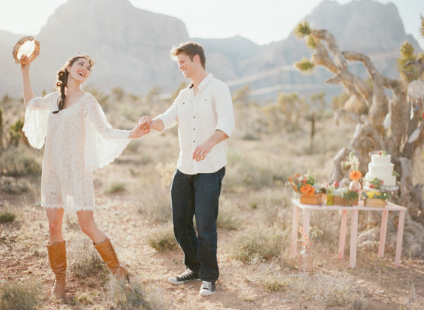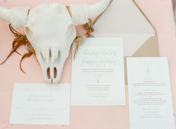 The young bride wears a vintage gown, knee high boots and hair crowns (courtesy Staysi Lee Bridal Boutique and Honey Pie Headbands), almost taking us back to the 60s or 70s. Cow skull accented stationery by Paper & Home in washed out turquoise tones reflect the scenery. It’s completely simple, stylish and a little bit different.