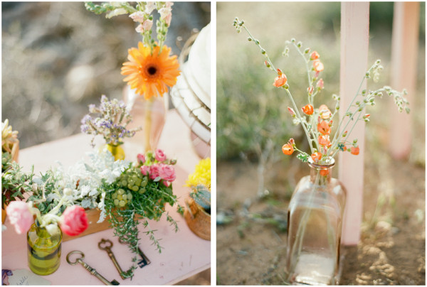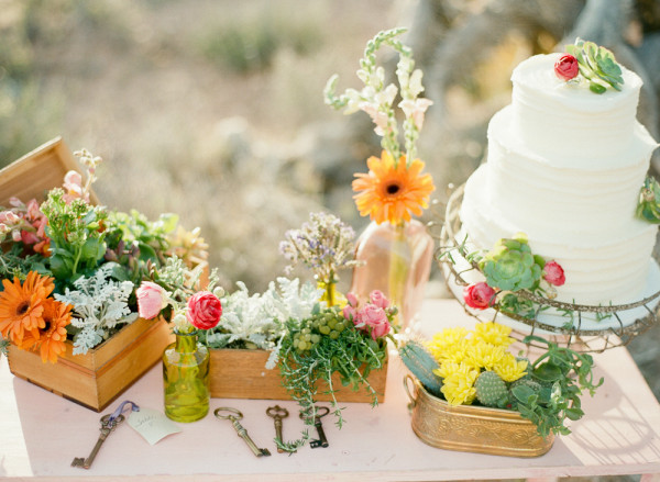 Assorted blooms by I Do Wedding Flowers in mixed vases and boxes add pops of color to the tablescape and to the nearly naked Retro Bakery cake. Being a desert wedding, you cannot miss a chance to incorporate succulents and other desert plants, either. I love the tiny potted cacti! Dreamcatchers hanging and other vintage props add to the photographs.