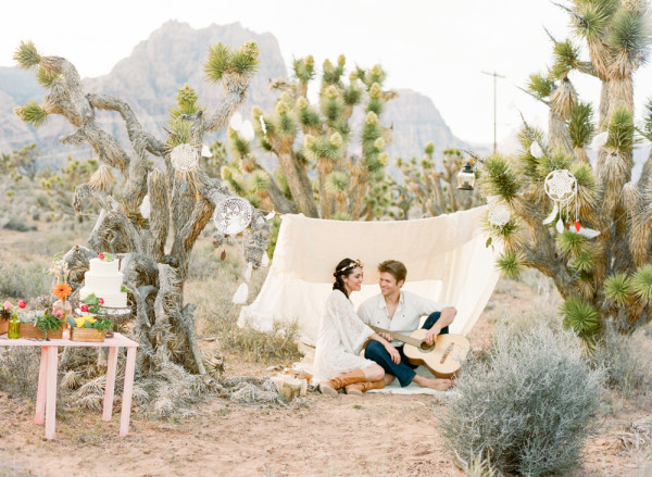 Photographer: Gaby J Photography / Shot on Location: Red Rock Canyon / Styled by: Gaby J Photography / Wedding Dress: Staysi Lee Bridal Boutique / Hair: Rosa Dunn / Makeup: Celina Rodriguez / Bride’s Flower Crown: Honey Pie Headbands / Floral:  I Do Wedding Flowers / Cake: Retro Bakery / Stationery: Paper & Home