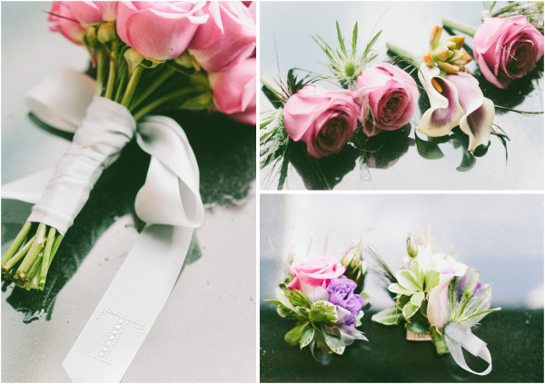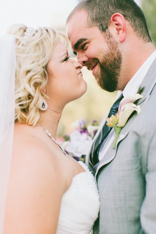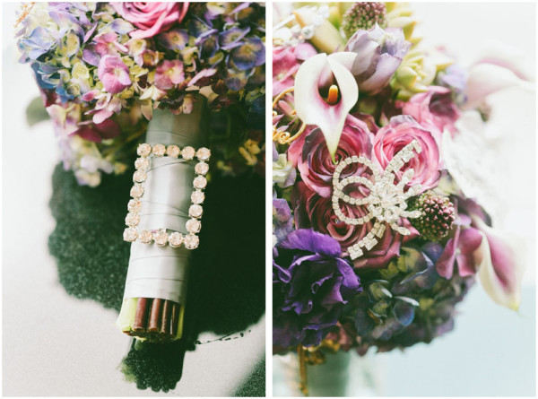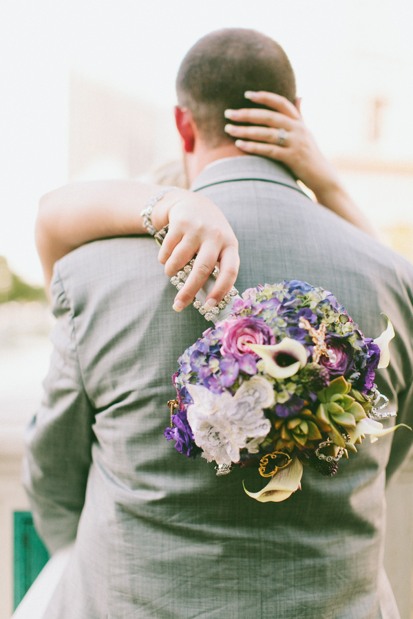 Laurel carried a round bouquet was composed of flowers in shades of lilac, lavender and purple including roses, lisianthus, hydrangeas and Picasso calla lillies, with some succulents for greenery, accented by vintage brooches and a piece of her mother’s bridal gown. Her bridal party wore deep purple gowns, and the men wore heather grey.
