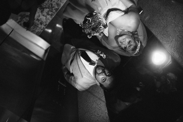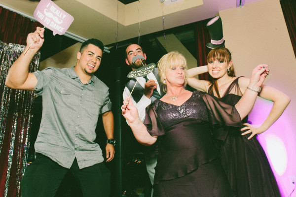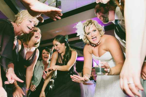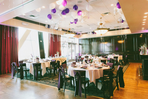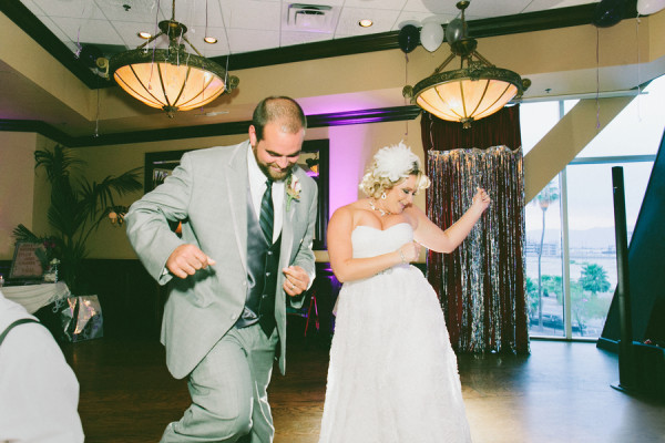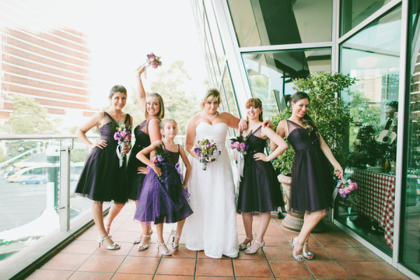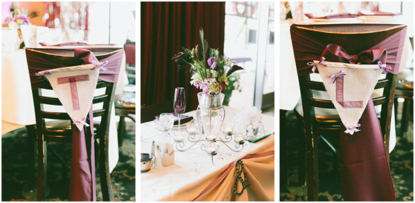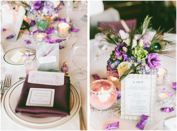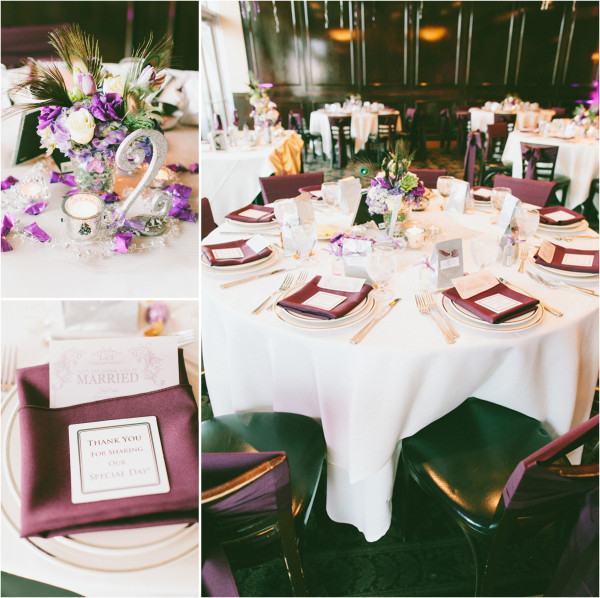 Following the vows, the party got started at Maggiano’s at Fashion Show Mall. More purple and plum decor showed up on the round tables, as well as in the linens and chair sashes. Rustic detailing like burlap seat buntings mixed with glamorous additions like luxe peacock feathers and sparkle dusted table numbers.