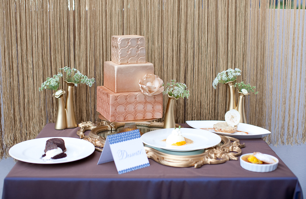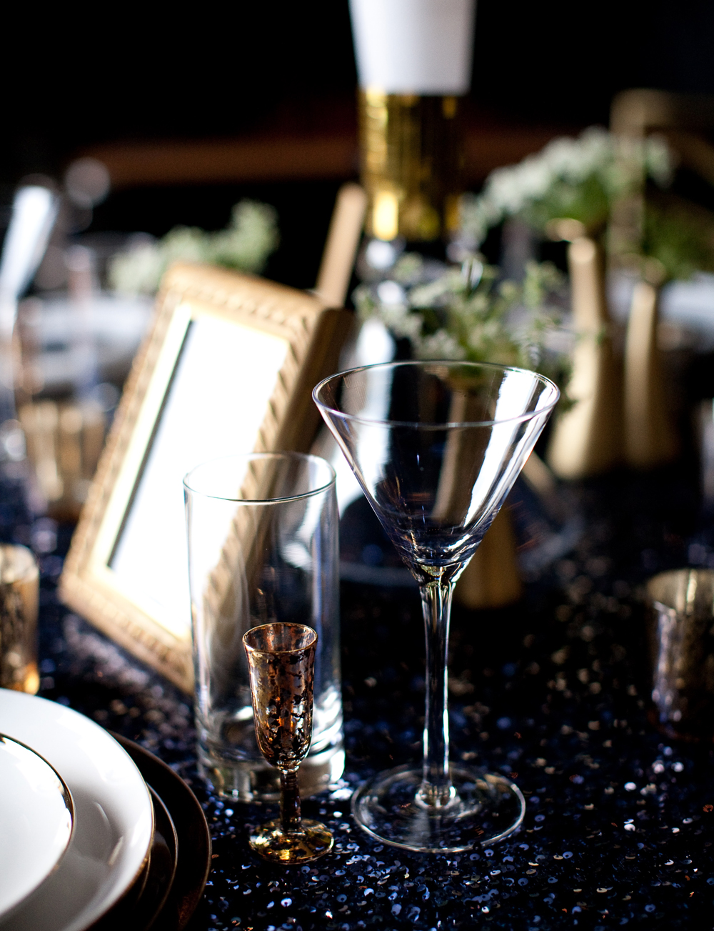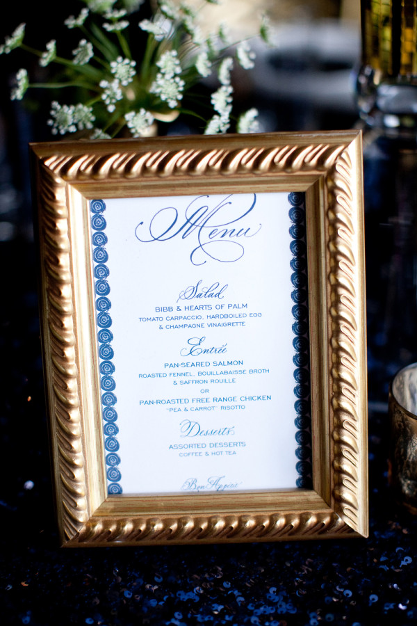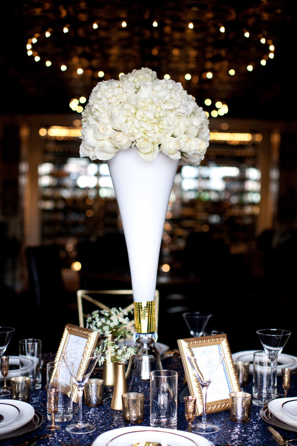 A sparkly deep blue linens adds depth to the golden details and reflective finishes of the tablescape, making this shoot truly shine. Pops of crisp white in the florals, china and stationery accent and anchor everything. I think you’ll agree it fits right in here on Super Sparkle Week and is a perfect way to end this fun run of posts!