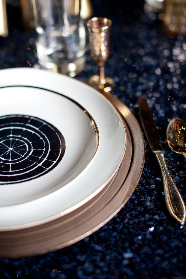 When I was thinking of a particularly sparkly event or wedding to feature on the blog for Super Sparkle Week, this styled wedding shoot, photographed by Nancy Van Thorre Photography, immediately leapt to mind, and not just because of the fabulous navy sequined linens by La Tavola!