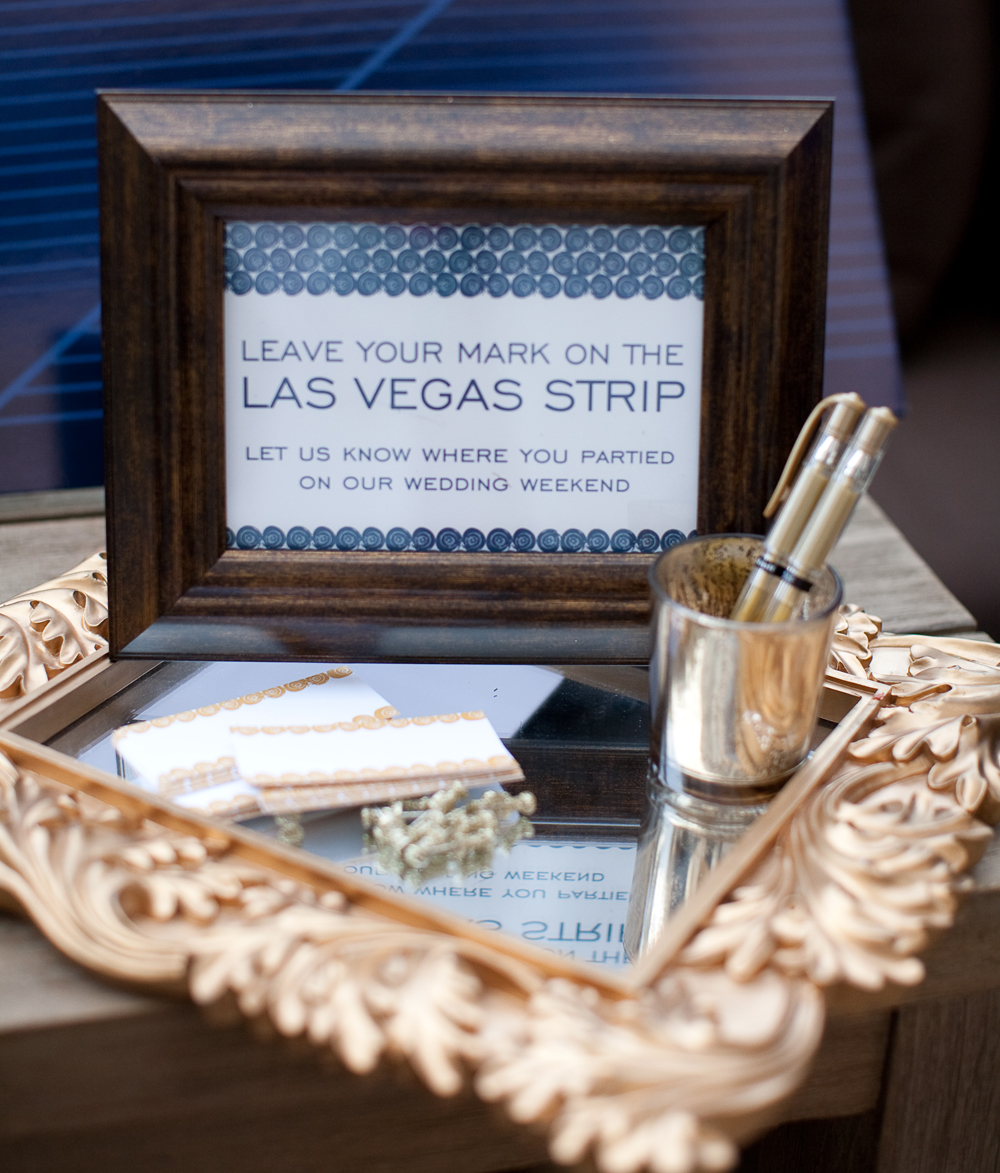 The venue offers an old school speakeasy feel, but the decor and design are infused with more contemporary elements like a metallic ombre cake and slinky bridal fashion. Woven in are a few little unexpected concepts to shake things up as well – like beer tasting flights, and a Las Vegas skyline sign and map designed by Paper & Home which wedding guests “marked” with the notecards on the locations they visited over the wedding weekend.