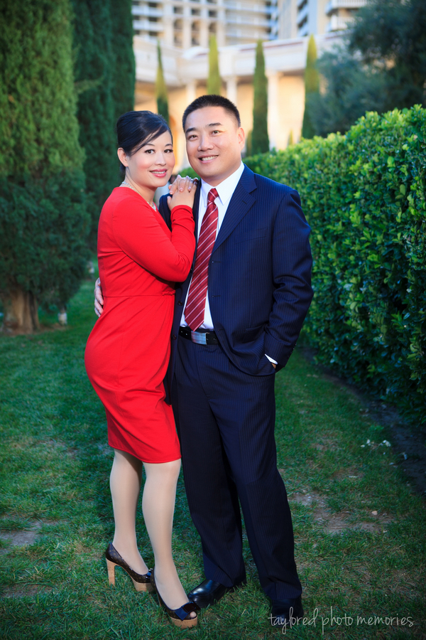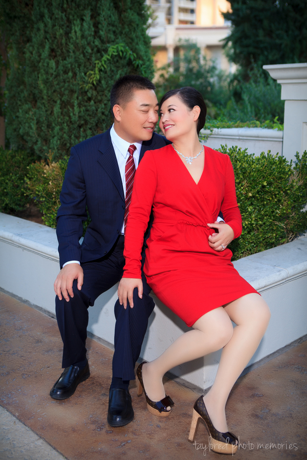 Following their traditional vows in the tiny Little Church of the West, Sophia and Tianliang had a couple’s shoot on The Strip with Taylored Photo Memories. Sophia changed out of her white gown and veil she wore for the ceremony, exchanging traditional wedding wear for a blazing red wrap dress for the photos, which took place in front of the romantic scenes of Caesars Palace, Bellagio and Paris Las Vegas. Although chapel packages often come with included photography, a couple’s shoot with another photographer is a great way to inject some individuality and get a set of more personal photographs.