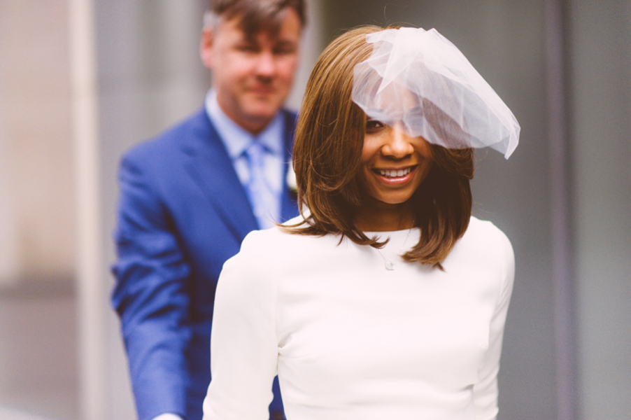 Preceded by two flower “girls” and a ring bearer, Lisa walked the aisle to Sinatra, wearing a full-skirted little white gown from French designer Delphine Manivet that was a modern reinterpretation of a 1950s style; very Vegas! Her hair was styled in a simple bob, adorned by a two tier blusher length tulle veil, and she held a round bouquet of classic red and white roses. Sean wore a simple blue suit with a single white rose on his lapel.
