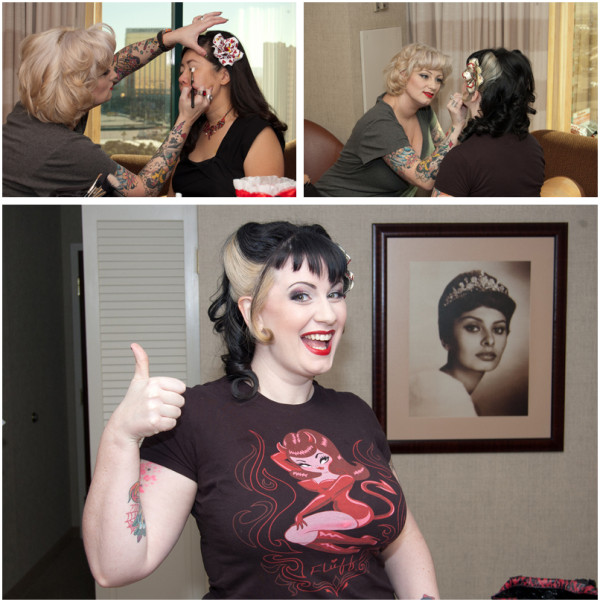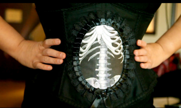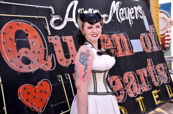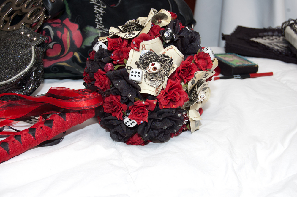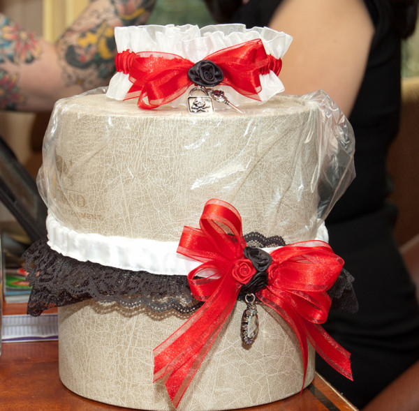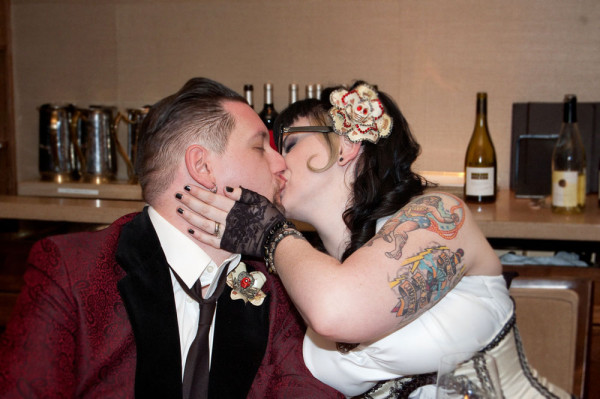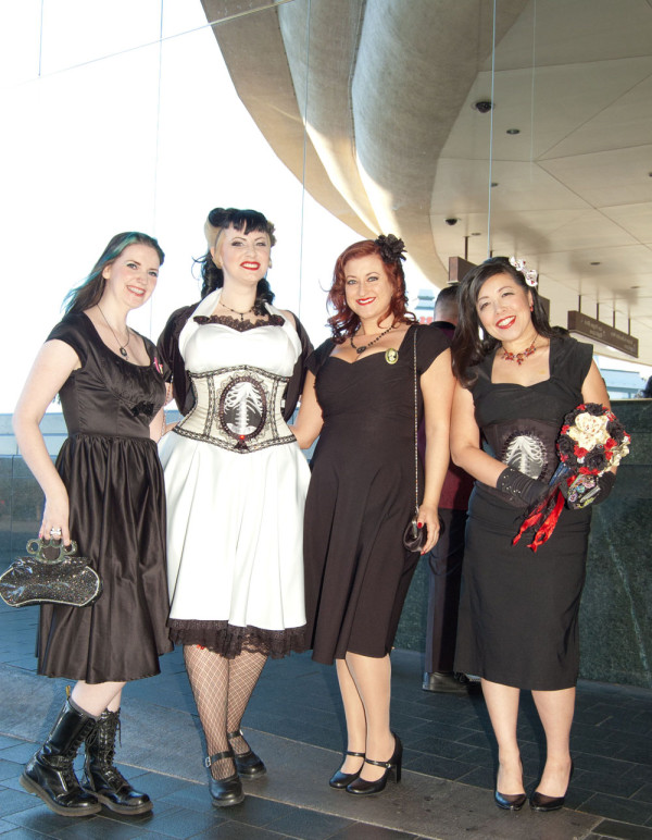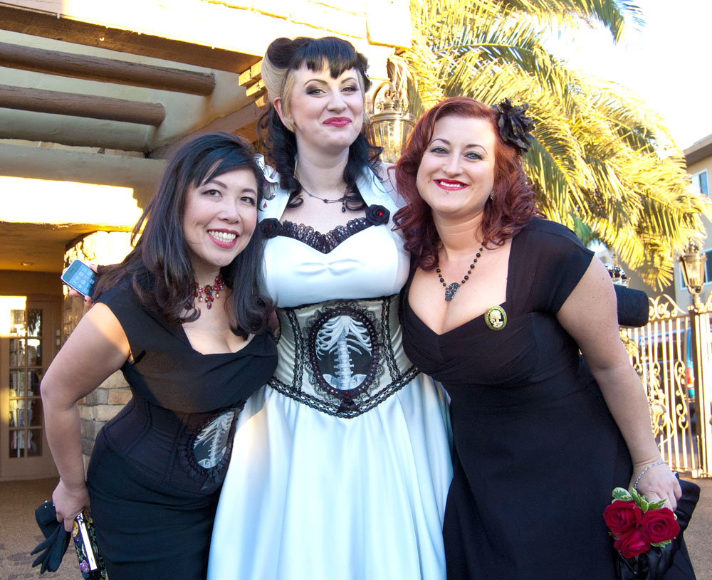 Paige rocked a customized Vivien of Holloway 1950s style halter sundress with black petticoat and a Louise Black skeleton cameo corset blinged out with Swarovskis, accessorized with black fishnets and black lace gloves. Her matron of honor wore a matching corset in black.