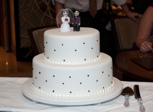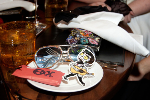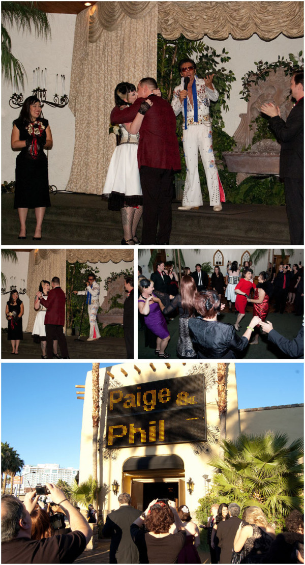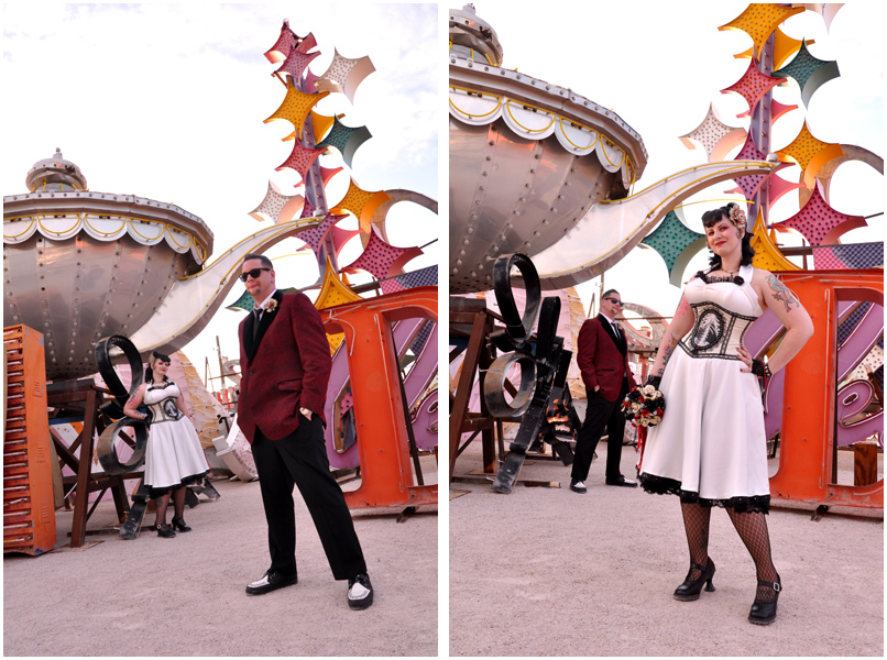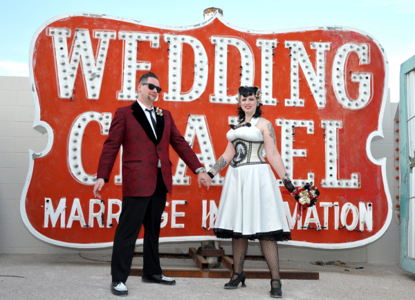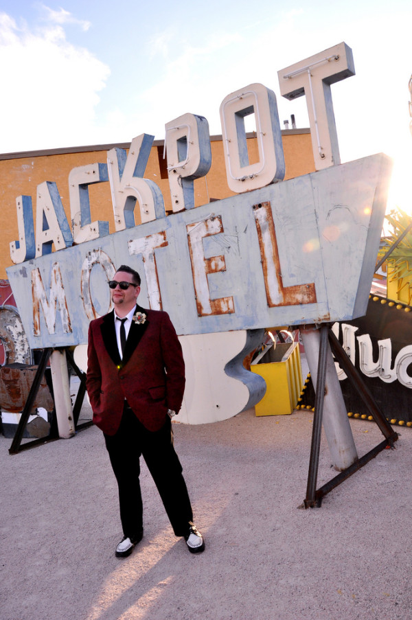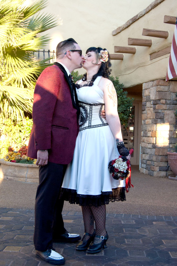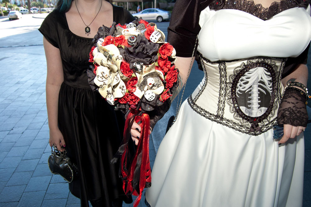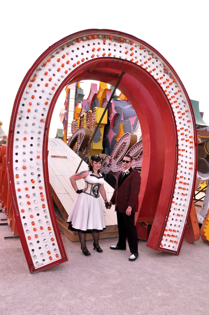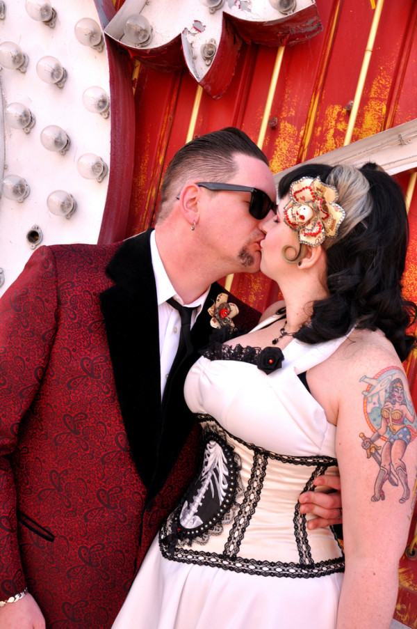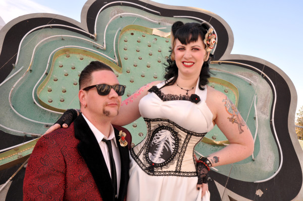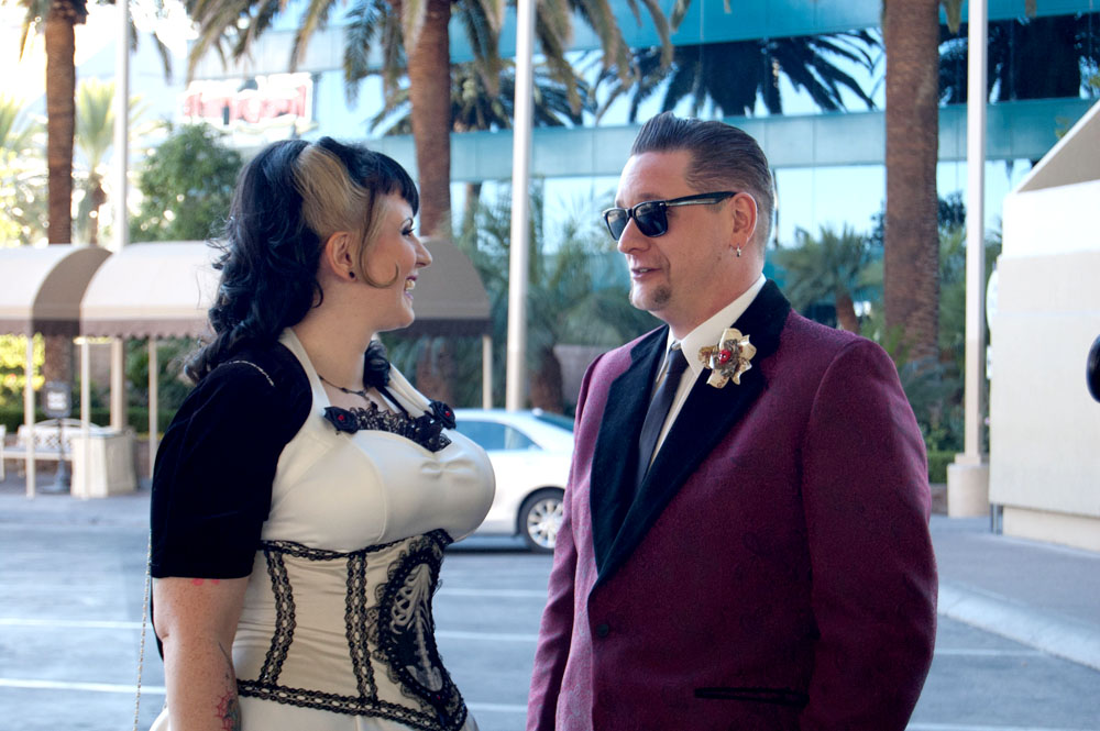 Photographer: Neon Boneyard – Glitter Lens Photography, all others – J. Hunt (friend of the bride and groom) / Videography: GEBBS Wedding Films / Wedding Venue: Viva Las Vegas Chapel / Reception Venue: Nobhill Tavern by Michael Mina at MGM Grand / Wedding Dress: Customized Ivory Duchess halter silk sundress by Vivien of Holloway, corset by Louise Black with custom detailing and alterations / Hair: Style by Sam at Shag Me Salon, Cut + Color by Nicole at David Alexander / Makeup: Karen Pumphrey / Hair Flowers: Little Asian Sweatshop / Boutonnières: Little Asian Sweatshop / Bride’s Shoes: John Fluevog “Gorgeous Mini” / Groom’s Suit + Menswear: Palm Beach Vintage jacket, JC Penney, Tie: Skinny Ties, shoes by TUK / Bouquet: Little Asian Sweatshop / Cake: Nobhill Tavern by Michael Mina / Caketopper: Mexican Sugar Skull / Favors: DIY, Little Asian Sweatshop skull and playing card hair flowers, Elvis sunglasses, Jose Pulido Elvis Calavera stickers