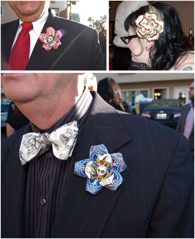Phil wore a vintage jacket, TUK creepers and a skull boutonnière made out of Red Dead Redemption playing cards. The boutonnières, hair flowers and bouquets were designed by the matron of honor Fenny of Little Asian Sweatshop, who also assisted with the wedding favors. A lot of the wedding was DIY, you can read about the projects here.Â