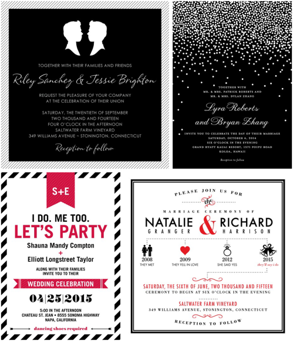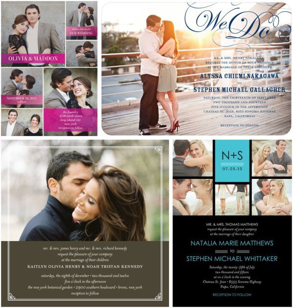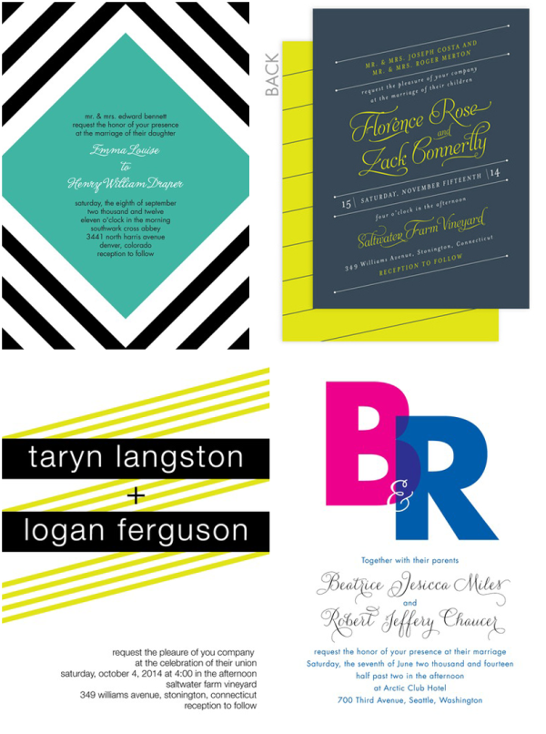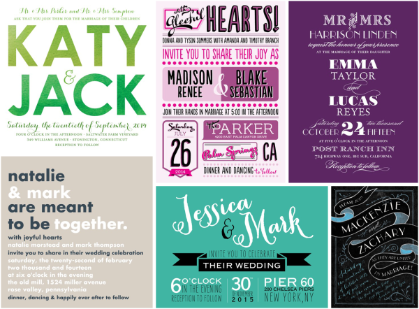 I’ve gathered a few of my favorites below, but you should know there are over 600 designs, all with customizable colors, typefaces, corners and paper and you can get a matching design for wedding programs, menus and even websites. How pro is that?