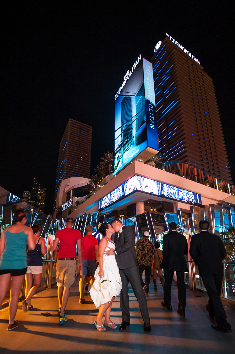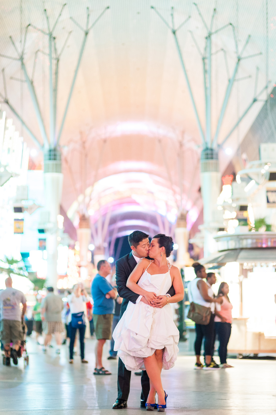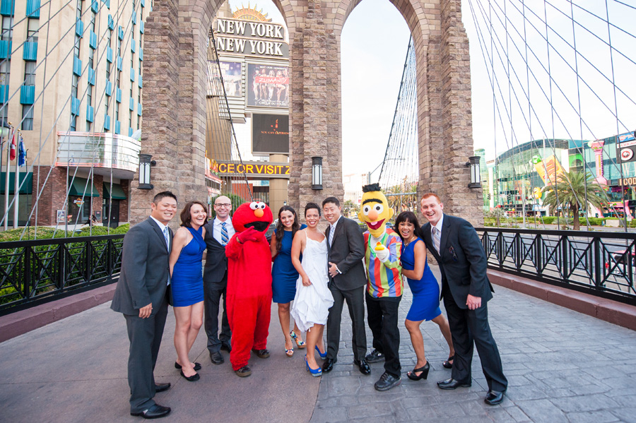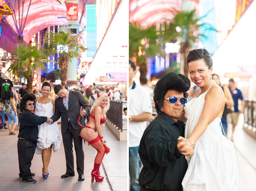 After roaming around the various floors in the hotel, we took over the Las Vegas Strip. Being that this couple met while living in New York, it only made sense to hit the mini-Brooklyn Bridge at the New York-New York casino and of course Elmo and Bert decided to drop on in to celebrate the occasion. We then decided to hit downtown or the “old†Vegas, which is always bound to bring a few surprises (which it did). The Fremont Street Experience (the “experience†part is accurately named) is full of life, colors, lights, and apparently that’s where you can also find a scantily clad blonde devil along with a younger and shorter Elvis. Â