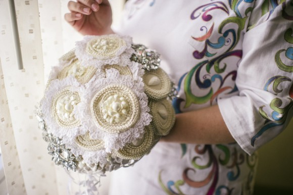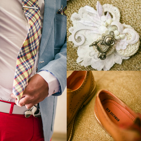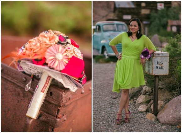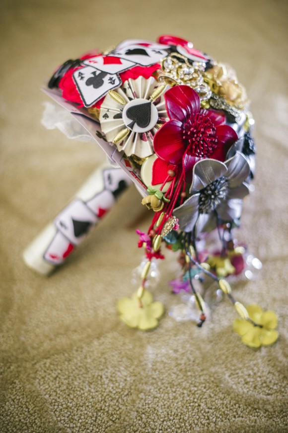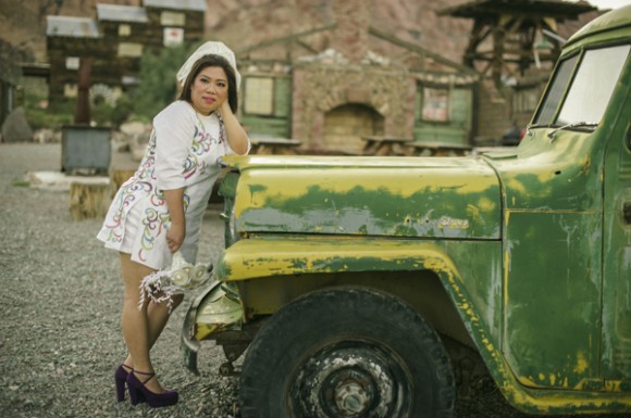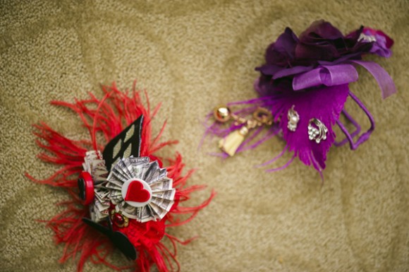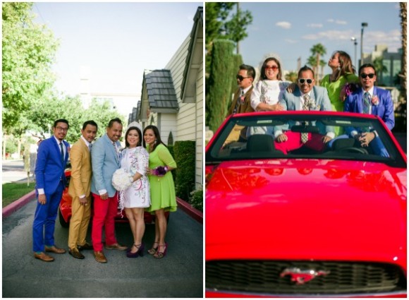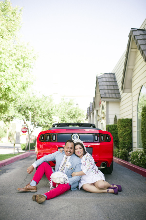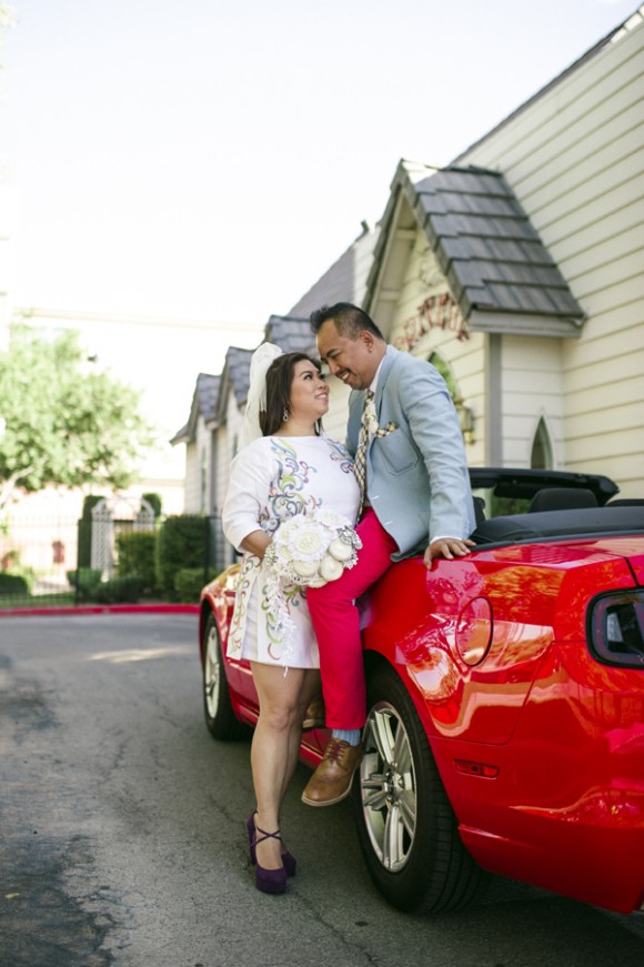 Benz wore a custom hand painted dress based on a tattoo she has. Abet, a Vespa lover, included scooter details in his accessories. Vegas appeared in a bouquet and corsages with a casino and gambling theme. When the time came, the couple drove up to the window in a red hot Ford Mustang and exchanged vows…again.