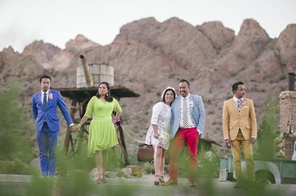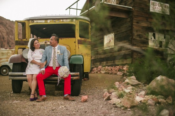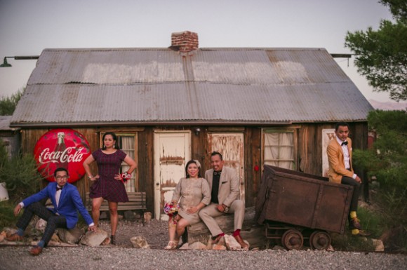 The 5 person wedding party then cruised down the highway in their convertible to Eldorado Canyon in Nelson to get some desert shots before indulging in dinner at Mon Ami Gabi back on The Strip. A totally fun and fabulous Vegas vow renewal!