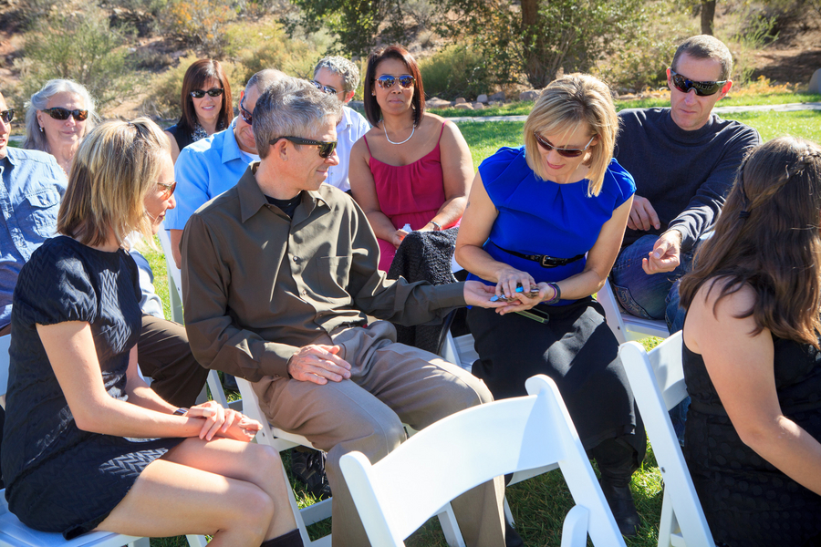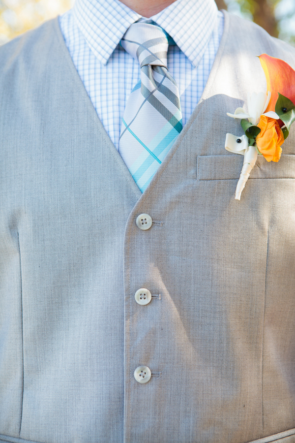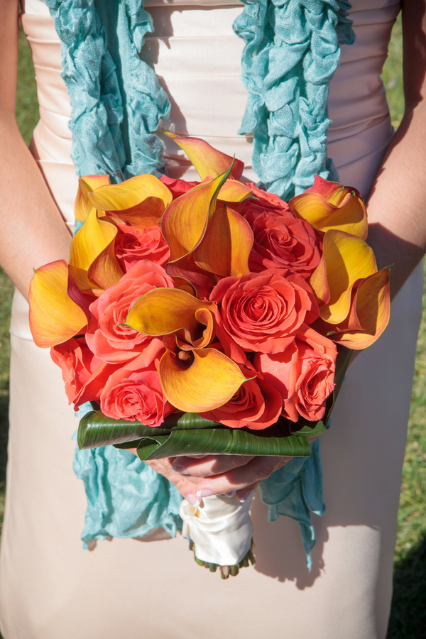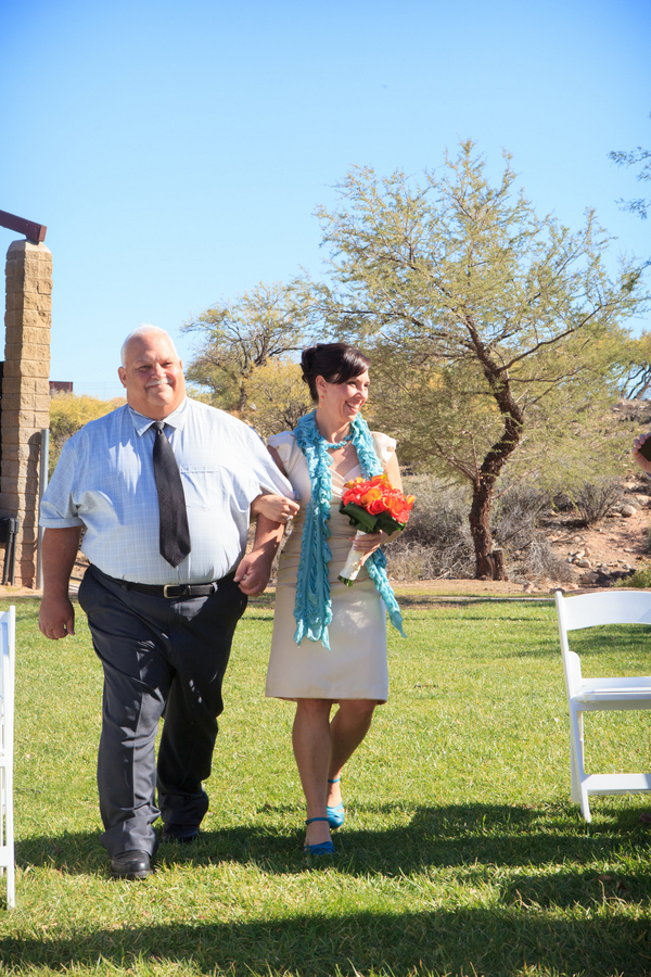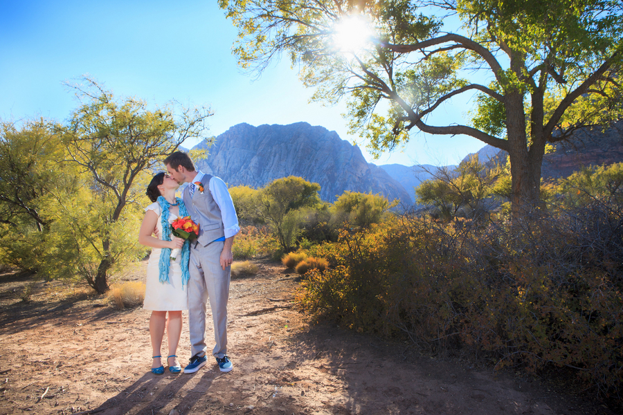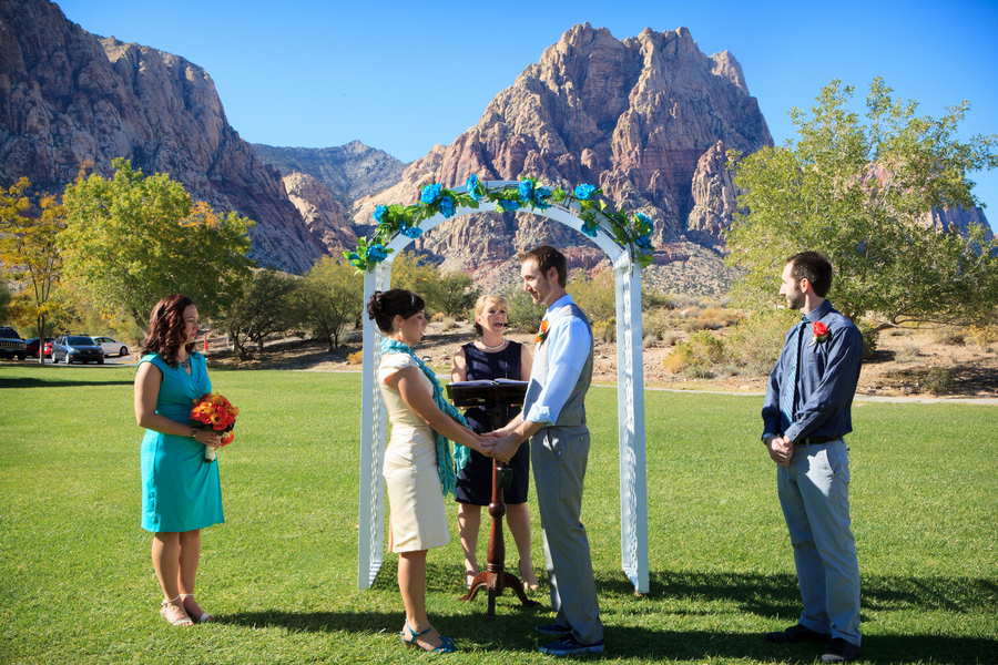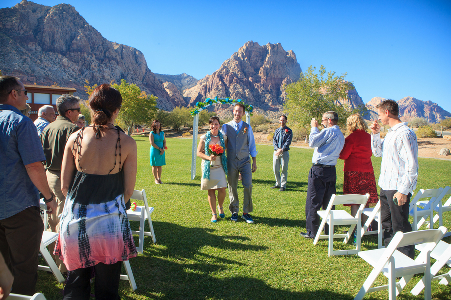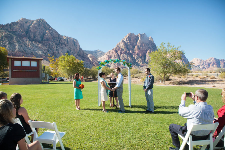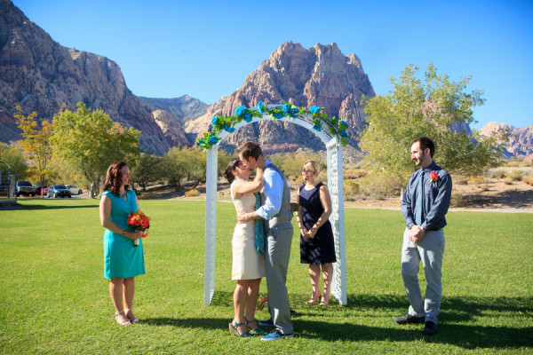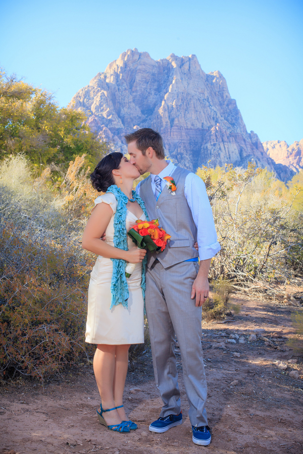 The ceremony was accompanied by a guitarist who played mostly songs by The Beatles, as requested by Nicole and Jeff. Nicole wore Alfred Angelo and carried a round bouquet of fire orange calla lilies and roses which not only complemented the teal palette, but the surrounding cliffs of the Red Rock mountains.