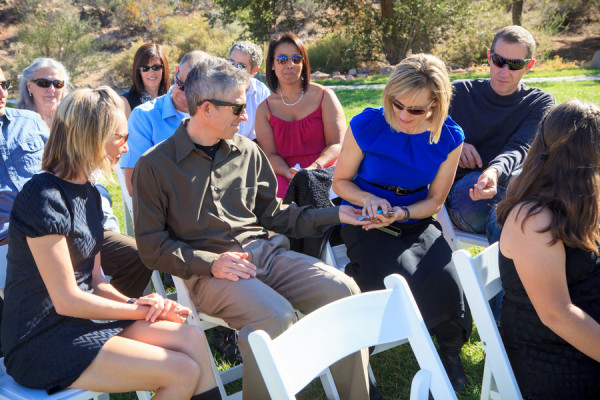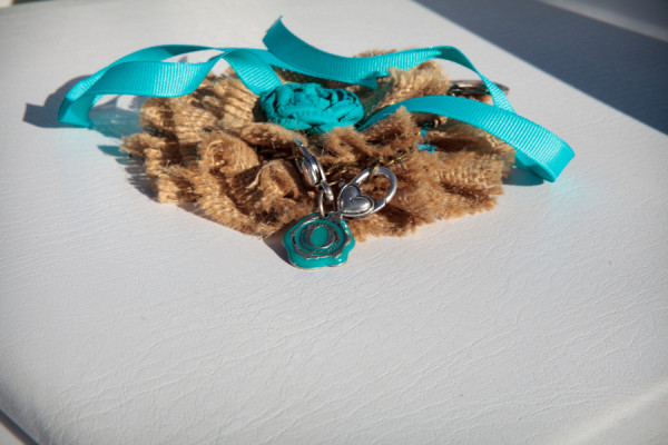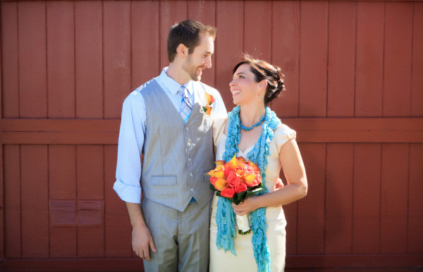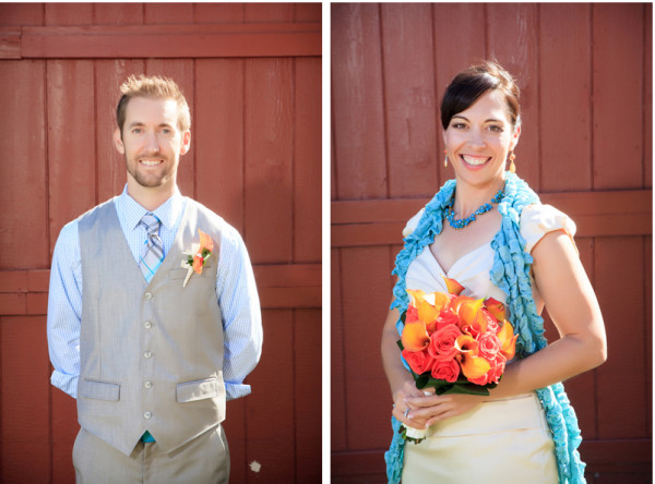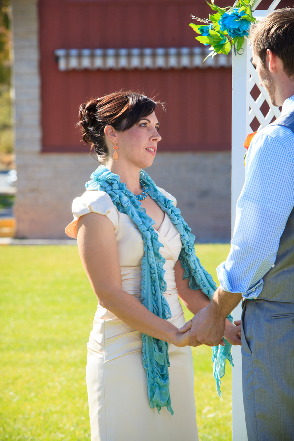 This outdoor wedding at Spring Mountain Ranch State Park is full of gorgeous teal, turquoise and blue accents – including the sky on what was a crystal clear autumn day! Nicole and Jeff, who met as they are both crazy for cycling, got married in an intimate ceremony that included a ring warming, on a ring pillow Nicole made herself. The couple had wanted a serene and natural venue, and found it in this gorgeous space.