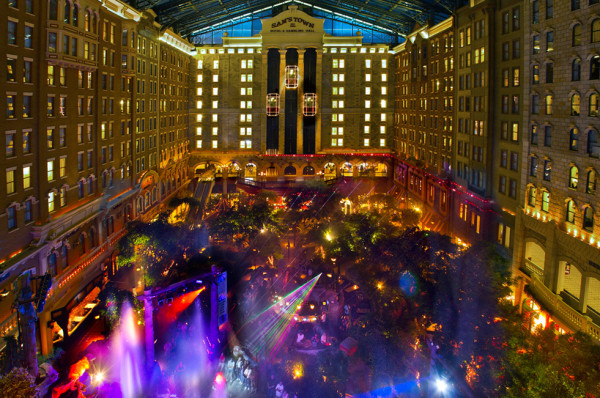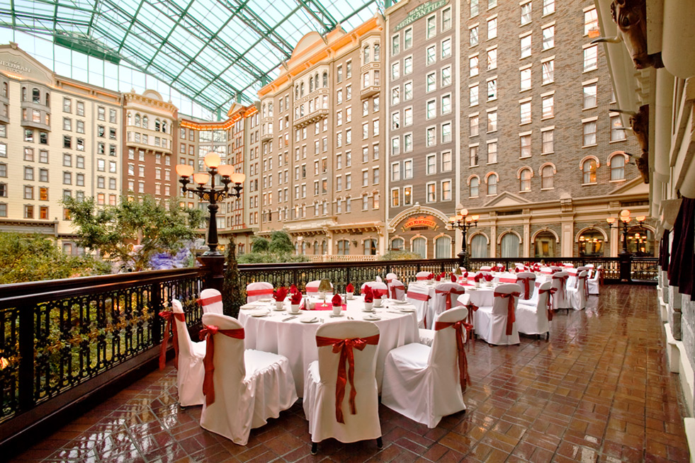 This locals casino and hotel with a mildly kitschy Old West/stampede theme is about 20 minutes off the Strip. It offers the standard range of somewhat drab hotel meeting rooms and function spaces, but what makes it really special is the 25,000 square foot atrium called Mystic Falls Park. It’s a toasty (nearly tropical, as in the winter when I visited) indoor setting with a lot of natural light and a patio that overlooks the half acre of waterfalls and trees of the park below from the second level. The overlook is available for ceremonies starting at $350 for up to 100 people.