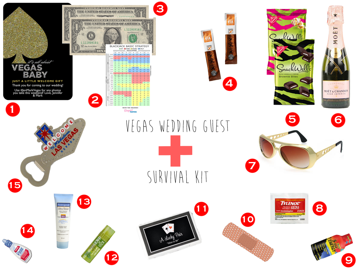 Create or purchase wedding welcome bags or “Vegas wedding emergency kits” to orient and welcome your wedding guests to the city. Keep an updated wedding website or wedding app (Vegas-ified, naturally) with detailed information and maps to where they need to be and at what time.