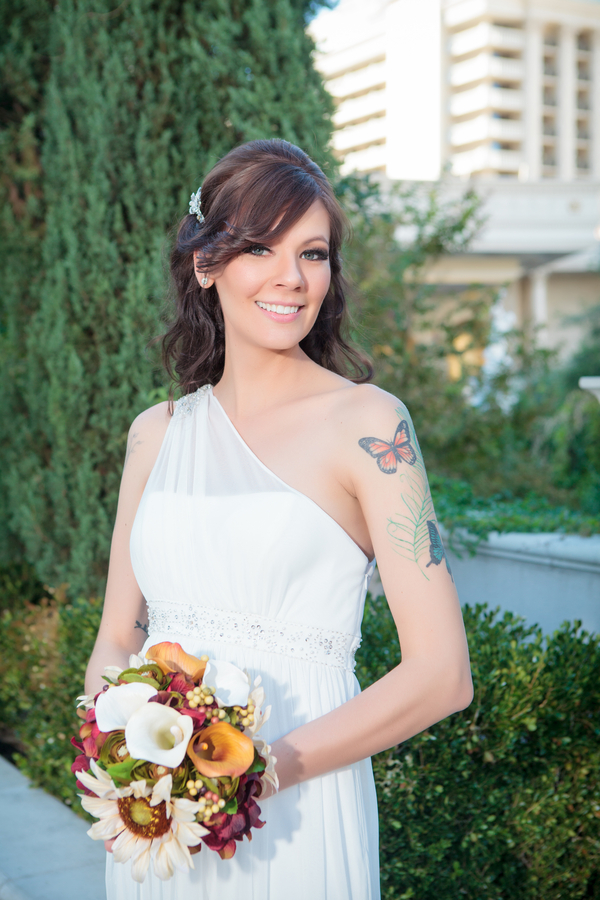 Photographer: Taylored Photo Memories / Ceremony Venue: Little Chapel of the Flowers / Reception Venue: Eiffel Tower Restaurant at Paris Las Vegas / Wedding Dress: David’s Bridal / Hair + Makeup: Muse Artistry / Bride’s Shoes: DSW / Groom’s Suit + Menswear: Men’s Wearhouse /  Floral: DIY by bride’s mother