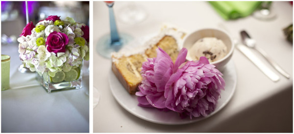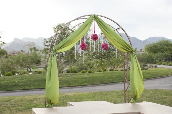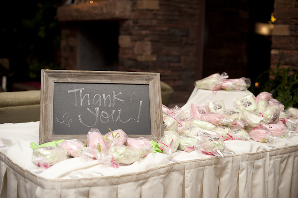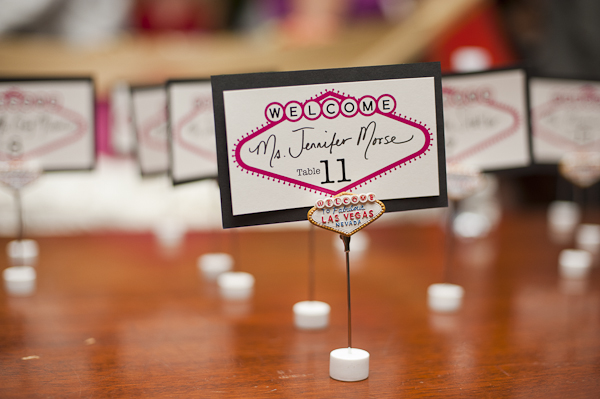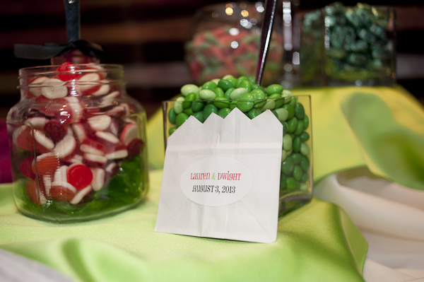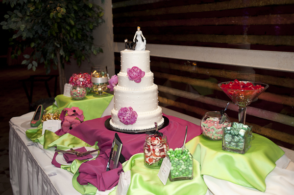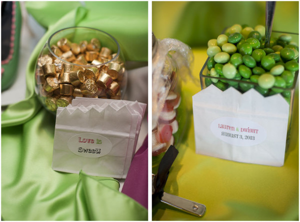 Little touches of Vegas whimsy were included in decor details including the guestbook, seating cards and wedding favors, many of which were handmade. The wedding palette of bright pops of pink and lime green carried over into the florals and amazing candy bar. I can’t stop drooling over the amazing photos of the food though… Read on for more details on this wedding from the bride!