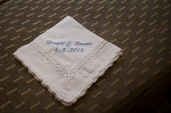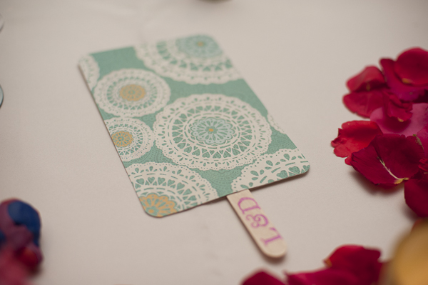 Since I am an art teacher and photographer much of the wedding had DIY touches. Lots of photographs of friends and family surrounded the cocktail hour and cake table. We handmade the fans, which also doubled as the wedding programs. My table numbers and the guest seating were handmade and designed by my matron of honor. I had handkerchiefs embroidered for all the men to wear in their coat pocket with a special message on the one for my husband and the sashes for the flower girls were DIY.