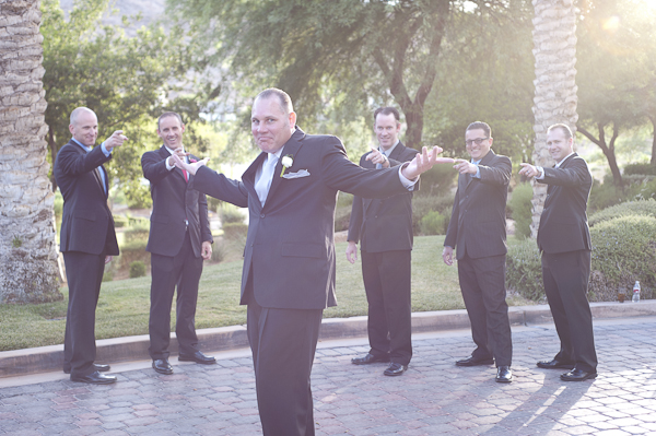 I had a cake topper of the bride dragging the groom, which everyone thought was really funny and the cake was delicious. Since I am a photography teacher, we incorporated a lot photography into the wedding such as: pictures of our grandparent’s wedding, a Las Vegas photo clip to hold the guest names, and a photo booth from ShutterBooth, which was a hit. Everyone loved getting into all the fun costumes and we received a memory book with all the images that our guests took.