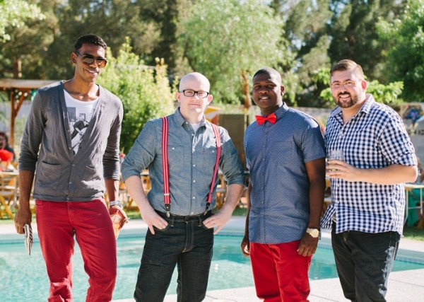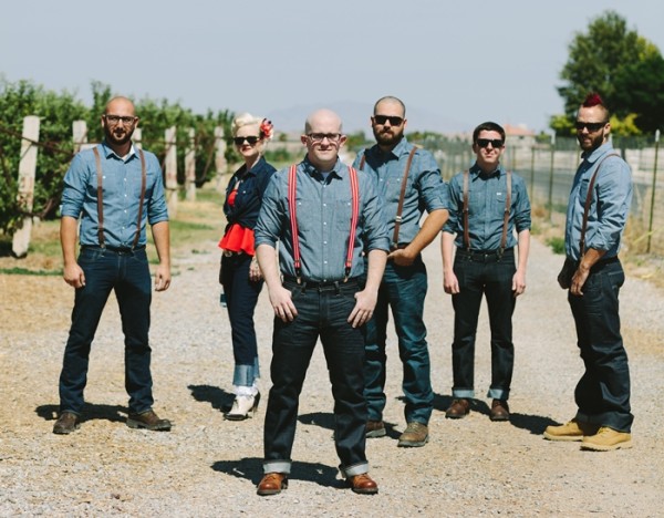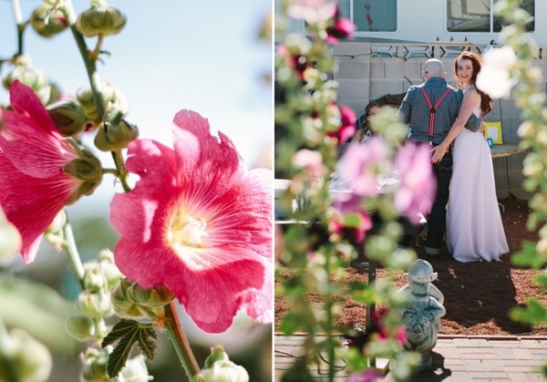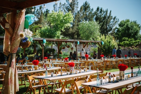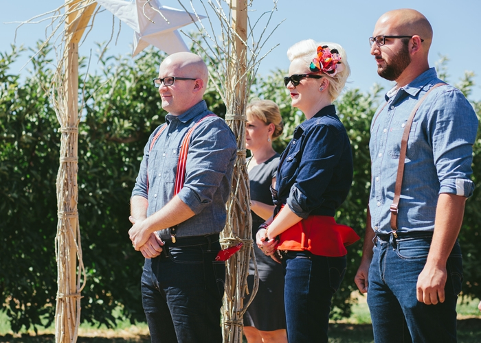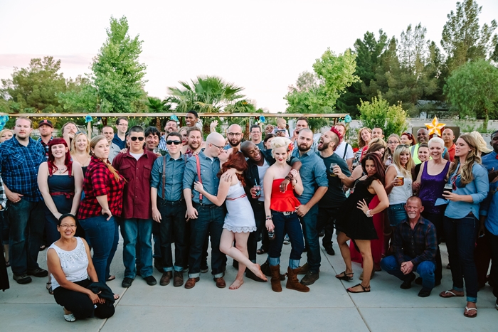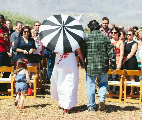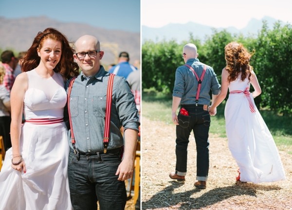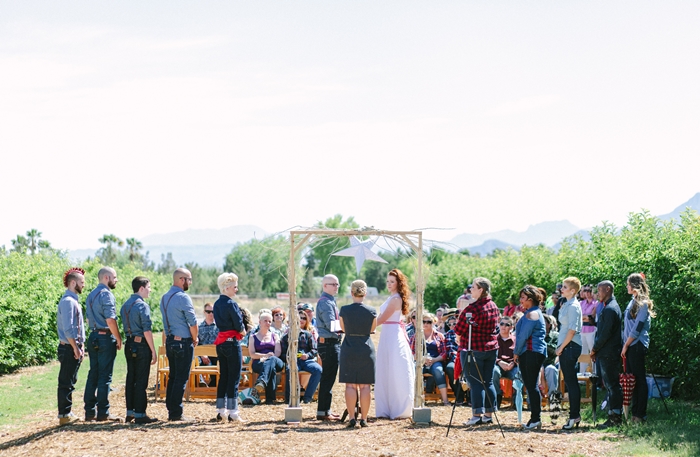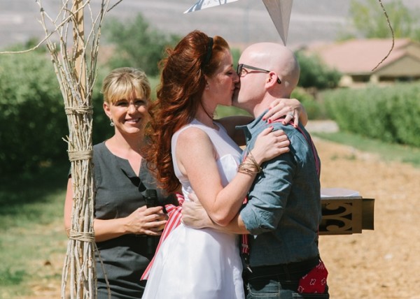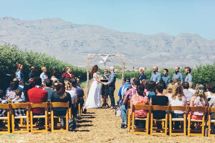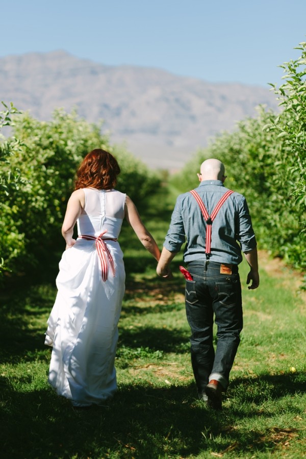 Photographer: Dennis Dayrit Photography // Ceremony + Reception Venue: Gilcrease Orchard, Las Vegas // Wedding Dress: DIY by the Bride // Hair: Friend of the Bride // Makeup: By the Bride // Catering: Homemade, Alcohol from Costco, Total Wine & More // Cake: Albertsons // Celebrant: Angie Kelly of Peachy Keen Unions // Stationery: Designed by the Bride // Chair and Table Rentals: RSVP Party Rentals // Vintage Furniture: Charleston Antique Mall // Portapotties: All American Waste Services // Candles: Collective Scents // Umbrellas: eBay // Suspenders: eBay
