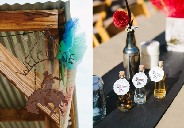 Instead of flowers, and my bridesmaids and I carried umbrellas. Tablescapes had handpainted and dyed bottles and vintage tins from my mother-in-law’s home, filled with an assortment of different plants and feathers. We covered the tables in butcher paper and put pencils everywhere so people would draw on them.