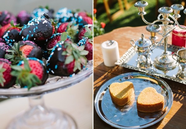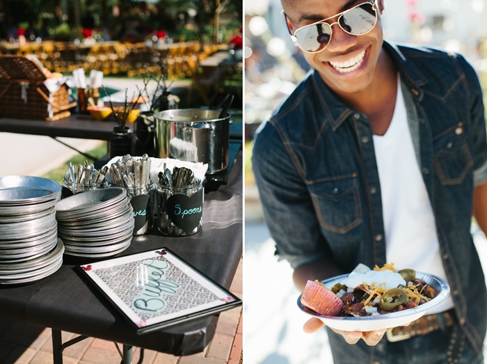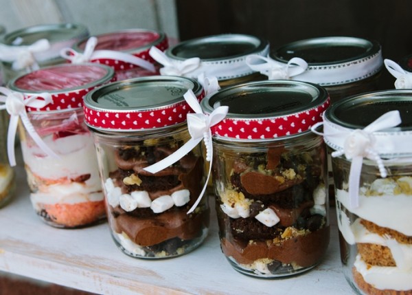 All the food was of course homemade. My amazing aunt cooked tons of chili a few nights before and we reheated it in big pots on portable burners. My sweet mother-in-law baked cornbread and after our disaster with the desserts threw together some batches of cookies and chocolate dipped strawberries and even had one of her friends make some cakes in jars, which got rave reviews.