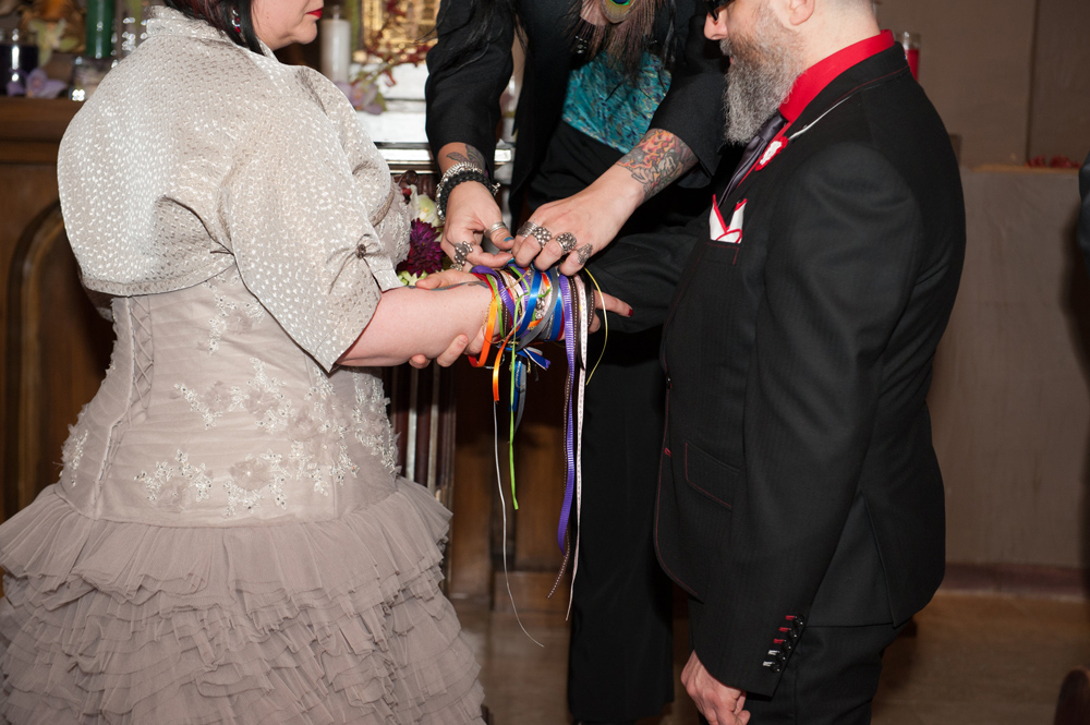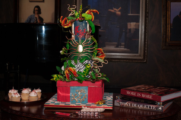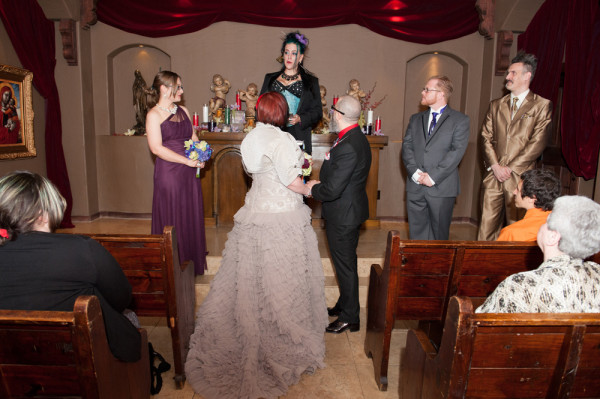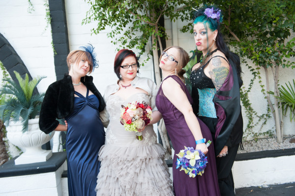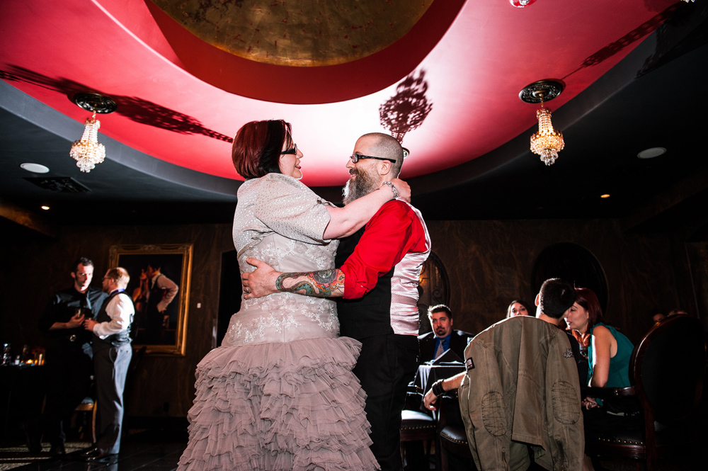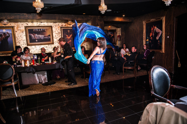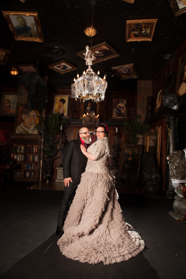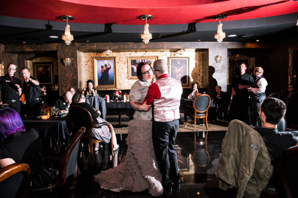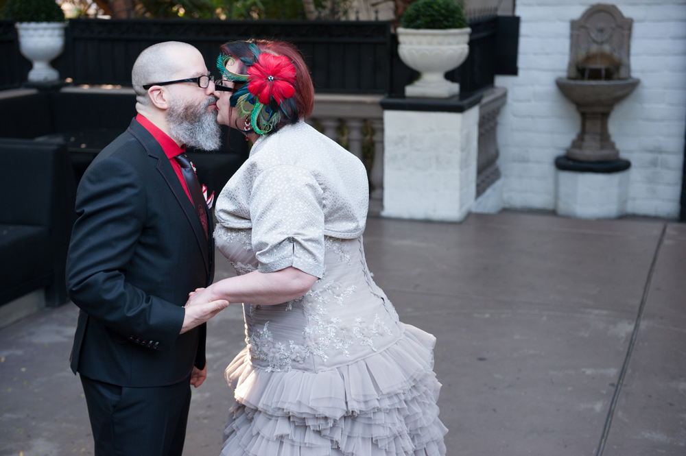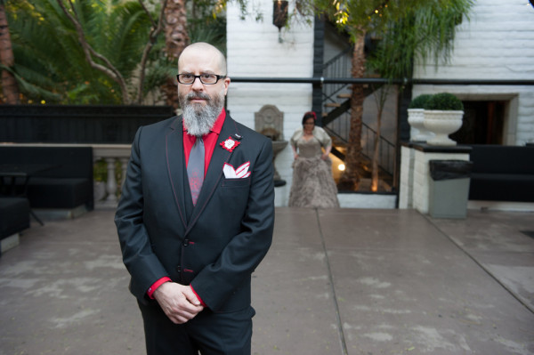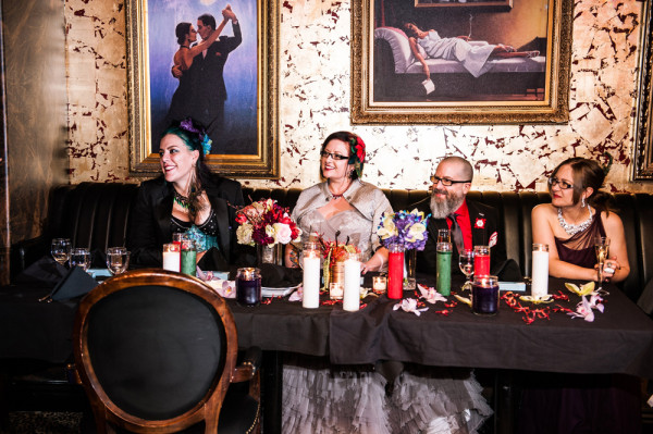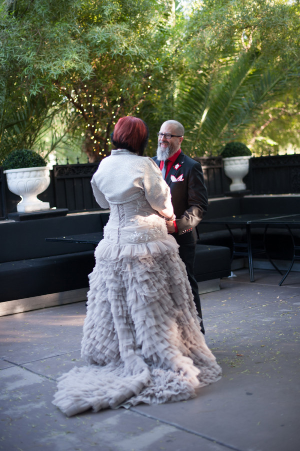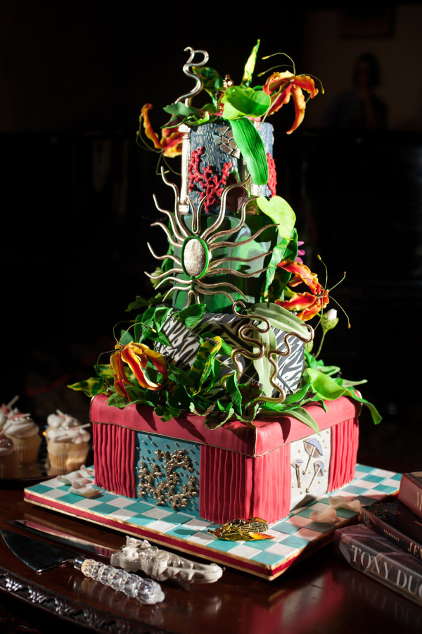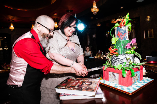 After getting ready at Vdara, they chose the gothy, appropriately art-themed boutique hotel The Artisan for their handfasting, vow renewal and wedding reception. A belly dancer entertained and a custom cake based on Tony Duquette’s designs enthralled. The elaborate cake (from Aracelli Zea Cake Studio) with vibrant colors and artistic shapes was a showstopper!