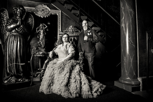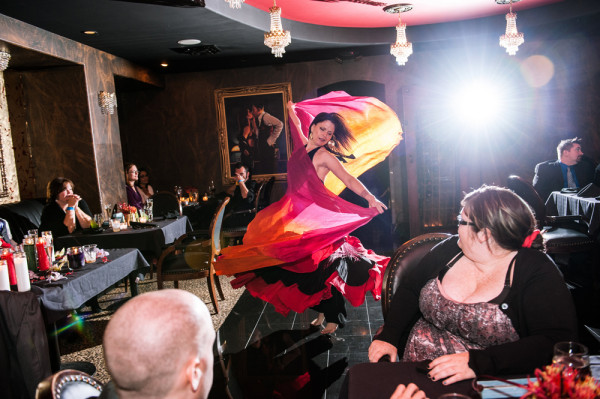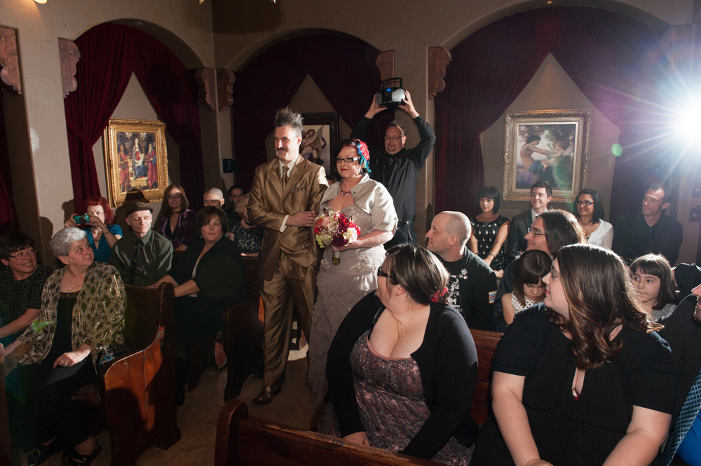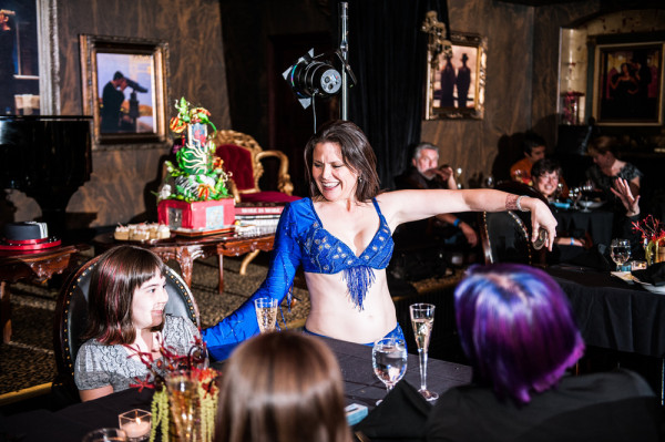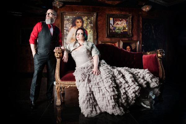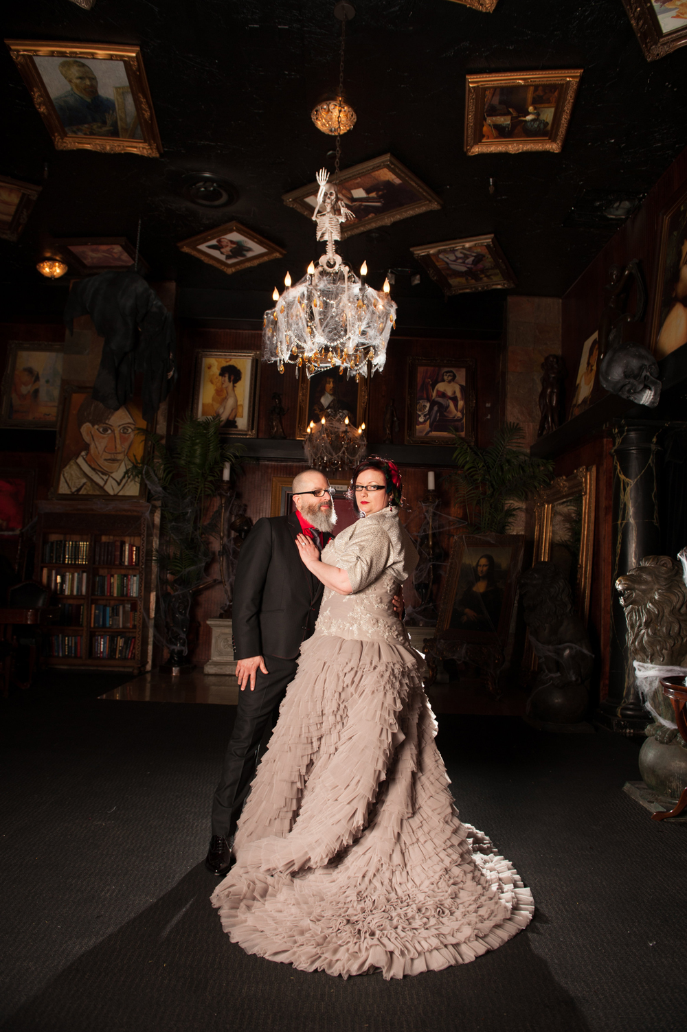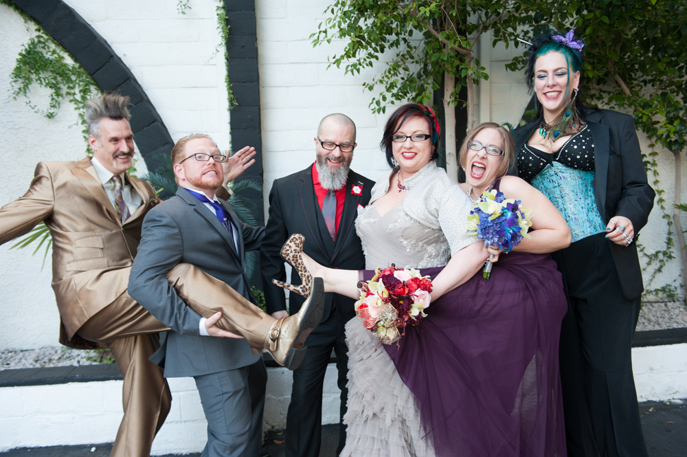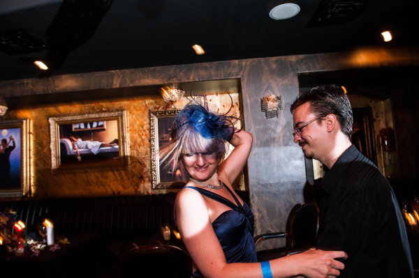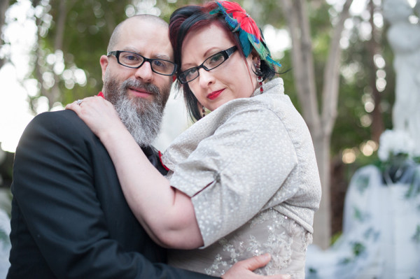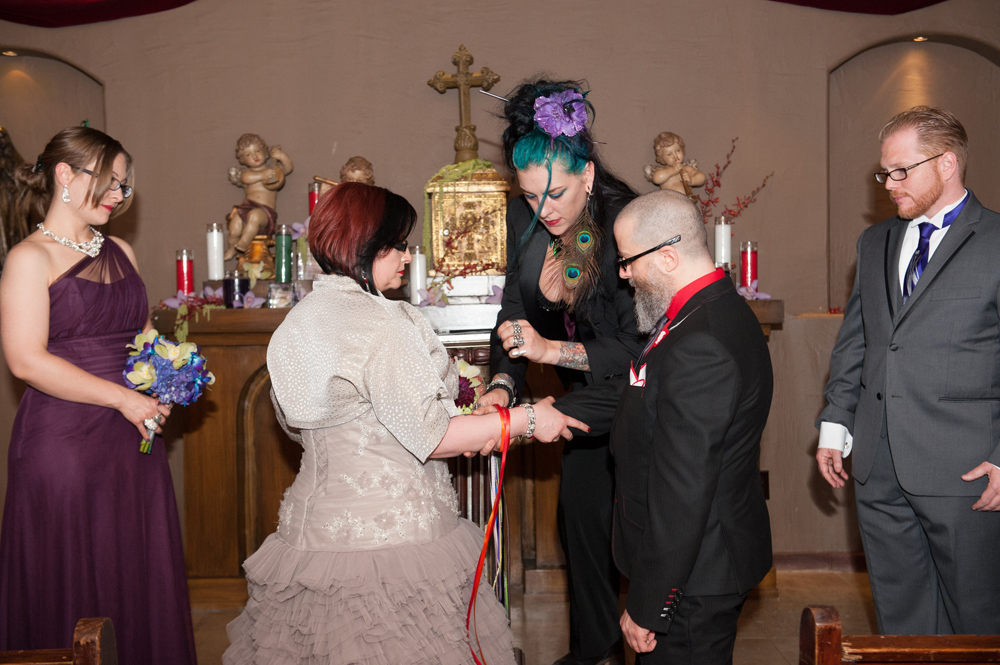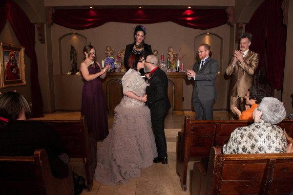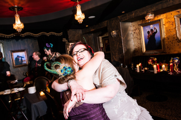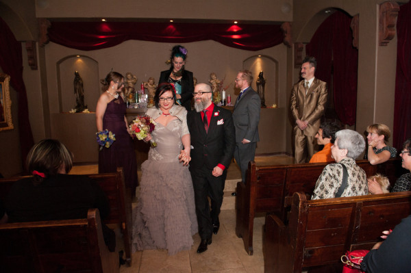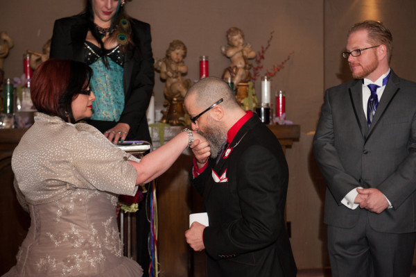 After getting ready at Vdara, they chose the gothy, appropriately art-themed boutique hotel The Artisan for their handfasting, vow renewal and wedding reception. A belly dancer entertained and a custom cake based on Tony Duquette’s designs enthralled. The elaborate cake (from Aracelli Zea Cake Studio) with vibrant colors and artistic shapes was a showstopper!