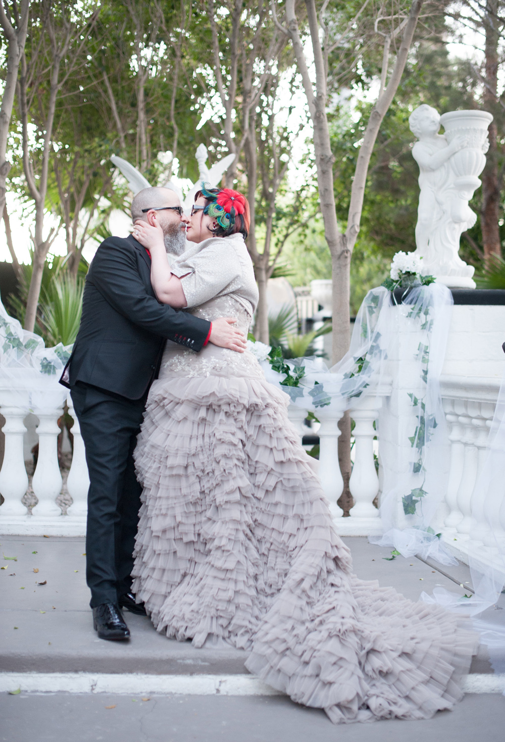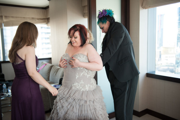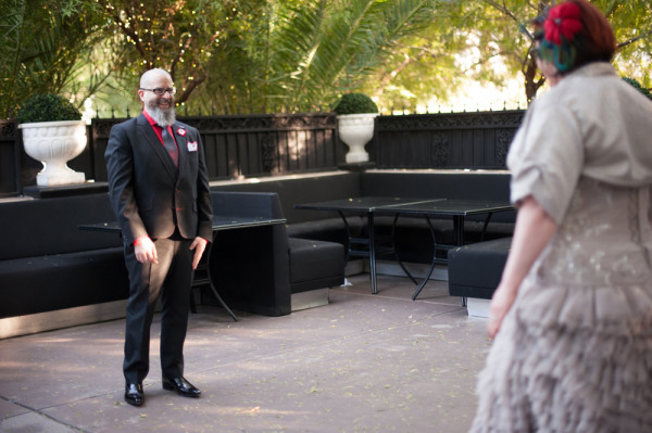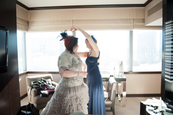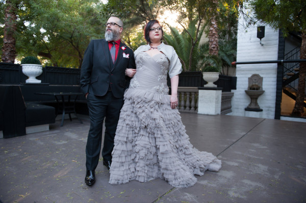 There’s just something about Las Vegas weddings that I think attract the coolest, most eclectic couples. Risk-takers, trendsetters and just generally awesome people, you know? I wasn’t able to get in touch with today’s couple for the interview as they are so incredibly busy, but I wanted to share their extraordinary wedding nonetheless. Extraordinary how? A dove grey wedding dress, amazing shoes, an incredibly stylish wedding party crew and a venue that fits so perfectly for this couple, it’s unreal.