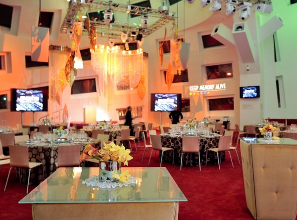 The Keep Memory Alive Center is technologically advanced, and offers huge plasma TV screens for displaying photo slide shows, in addition to incredible sound and a customized light setup for both inside and outside the building. Included in the center venue rental fees are additional custom decor touches: Gehry-designed furniture, custom linens, dishes and glassware featuring the first sketch that inspired the building’s design.