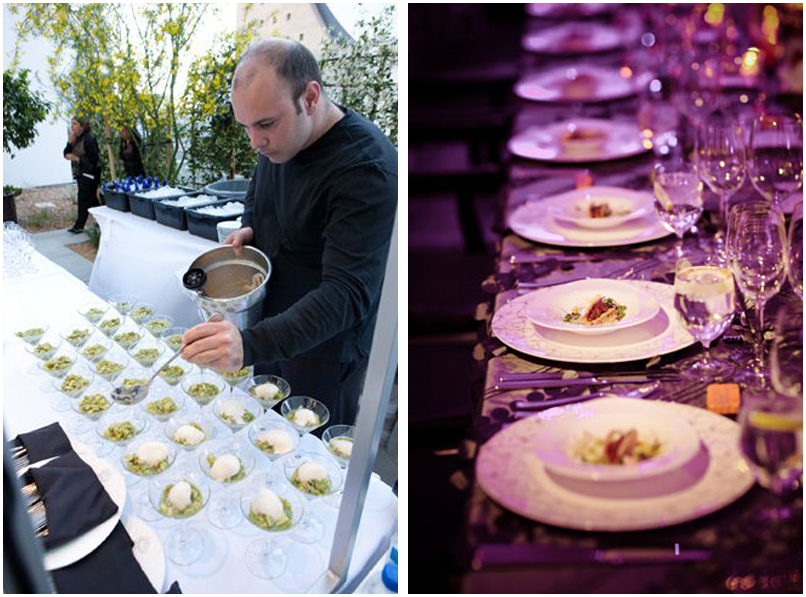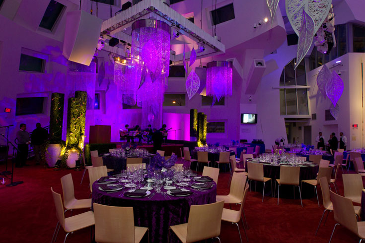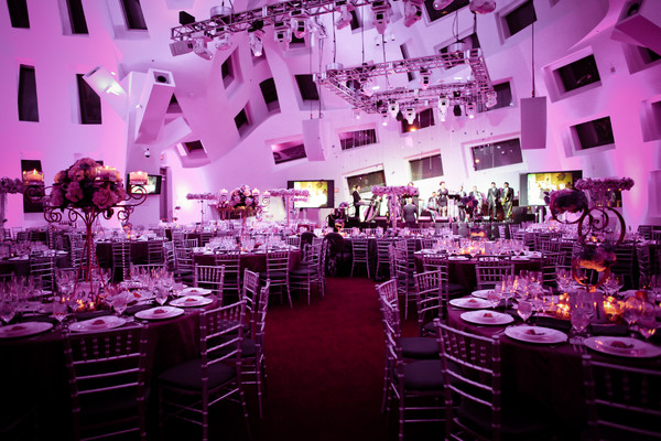 Also included in the venue rental rates are: custom Gehry designed linens in various colors, exquisite custom-designed Narumi china, Reidel glassware and flatware. You are also granted access to the custom LED lighting package which offers various pre-programmed colors and completely changes the space. (Seriously, it’s incredible.) Audio/visual setups are possible, but the costs are additional.
