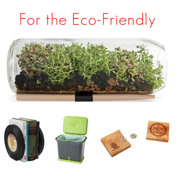 For the Eco-Minded: Recycled Record Bookends / Fresh Air Compost Collector / Sedum Terrarium Bottle / Reclaimed Bike Gear Coasters + Bottle Opener