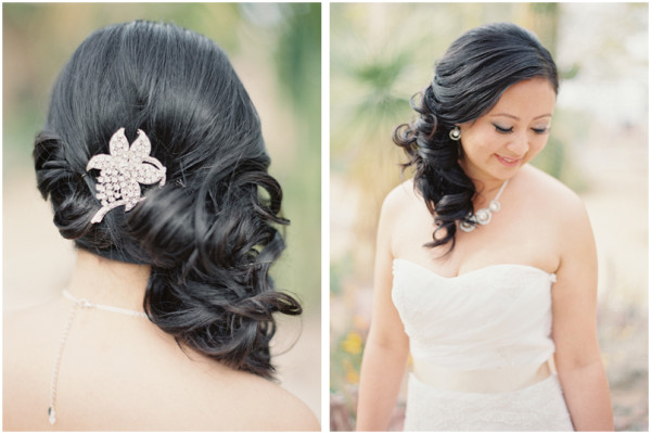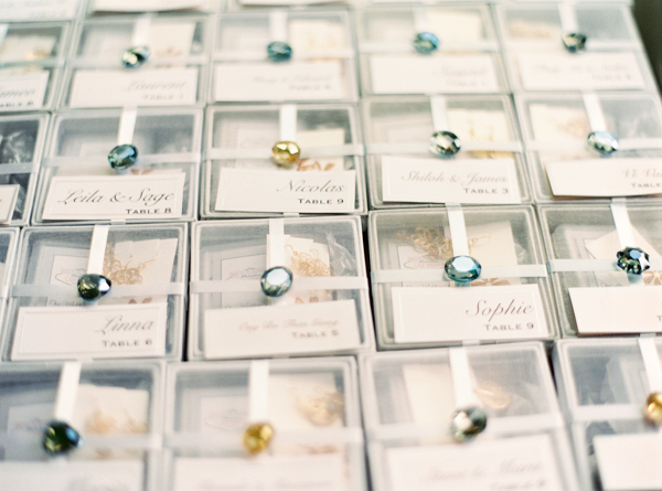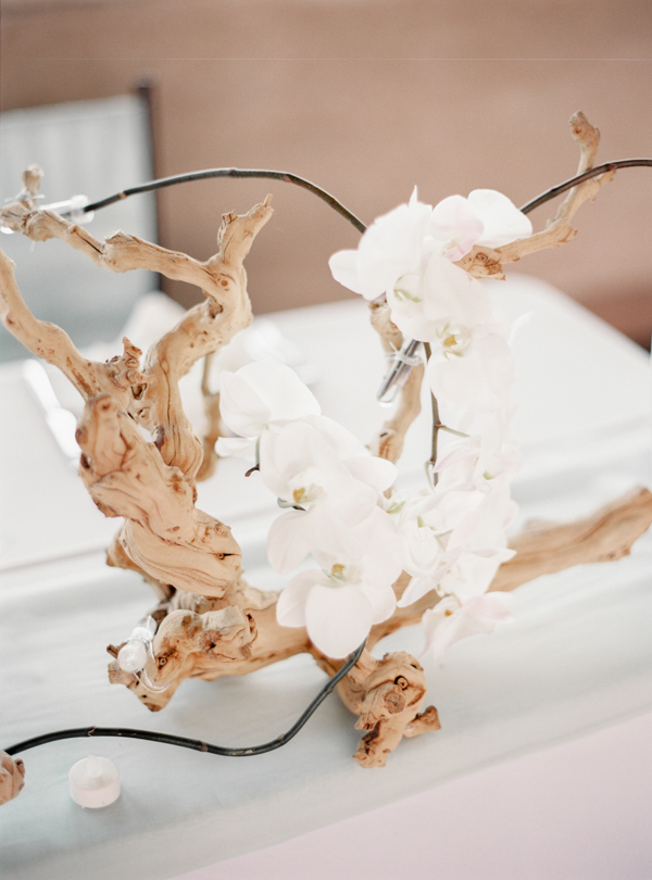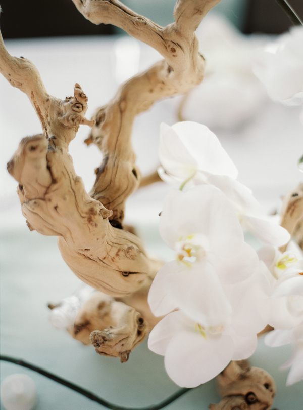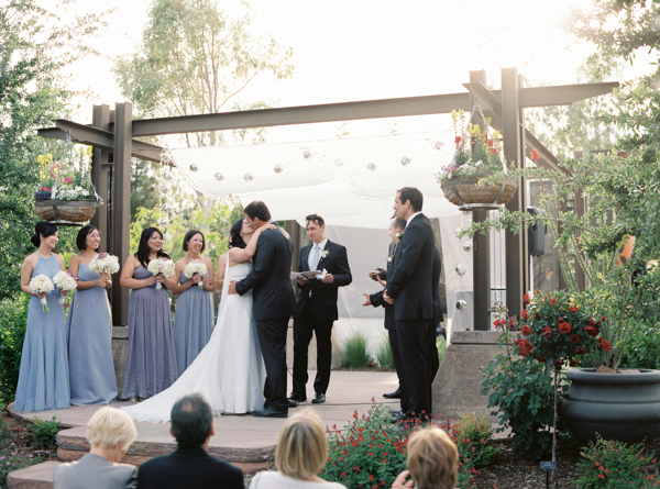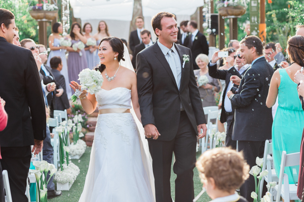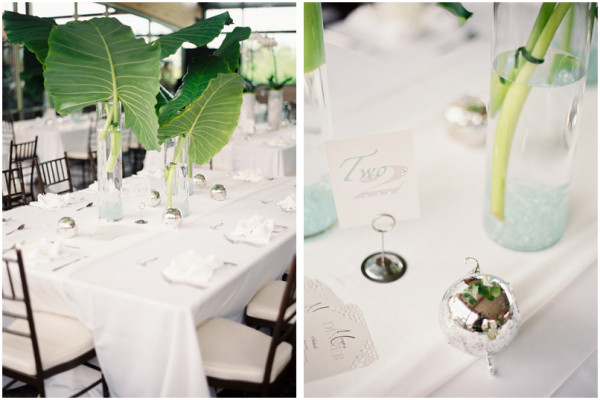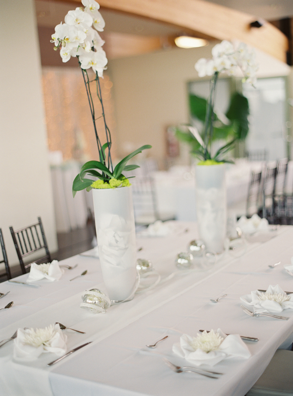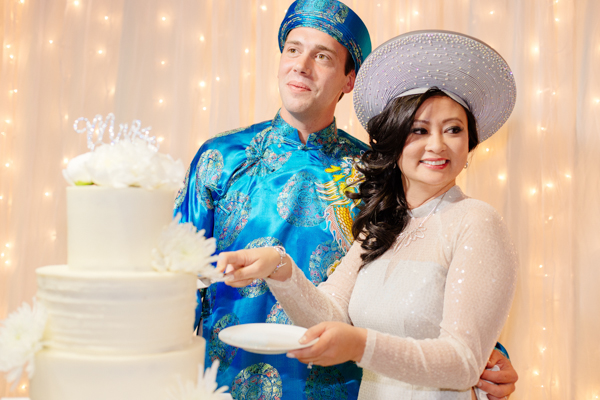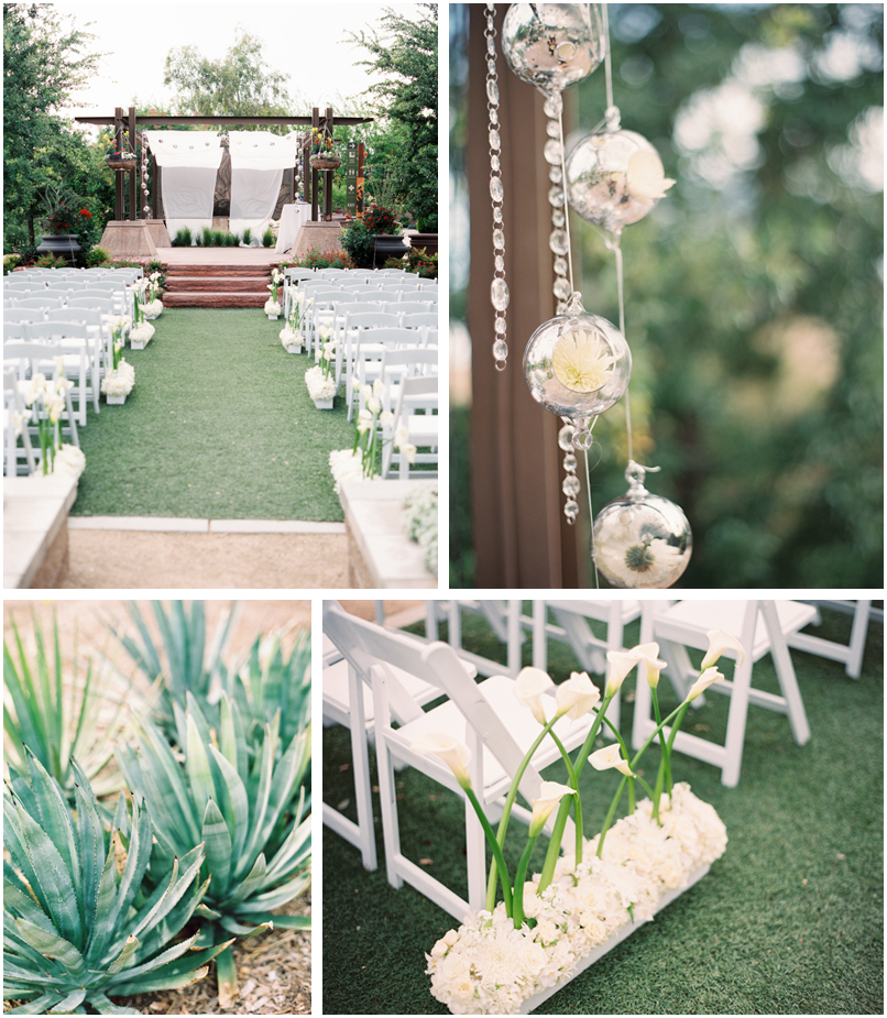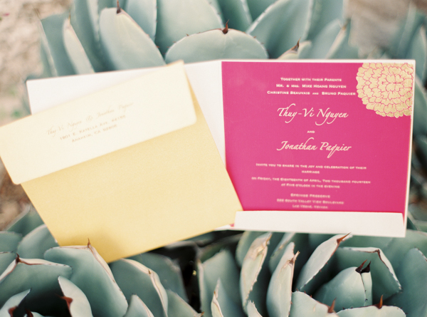 Their wedding mixed a number of different themes and styles, true to this jetsetting couple’s lives: desert garden combined with tropical Vietnam with a touch of European elegance. The ceremony featured floral details: a calla lily lined aisle, and an arbor strung with glass bubbles filled with chrysthanthemums. Thuy and Jonathan also provided a tea ceremony service for their guests.