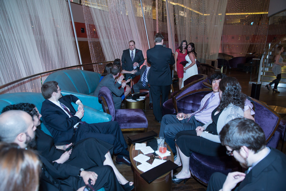 I think it’s also worth mentioning the night before the wedding events – the happy hour we hosted in the Boulevard Suite and the Double Decker Bus. The suite was AMAZING. Floor to ceiling windows overlooking the Bellagio Fountains. Plenty of comfy seating and room for 48 people to mingle, and there was a ping pong table! We also played the shoe game, my sister set it up. It was very cute.