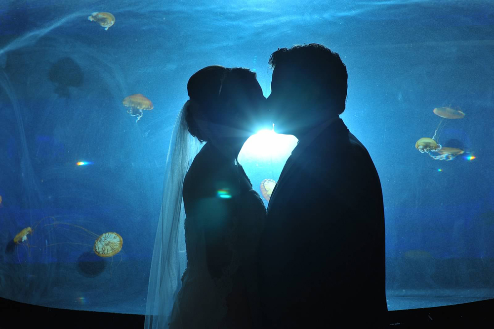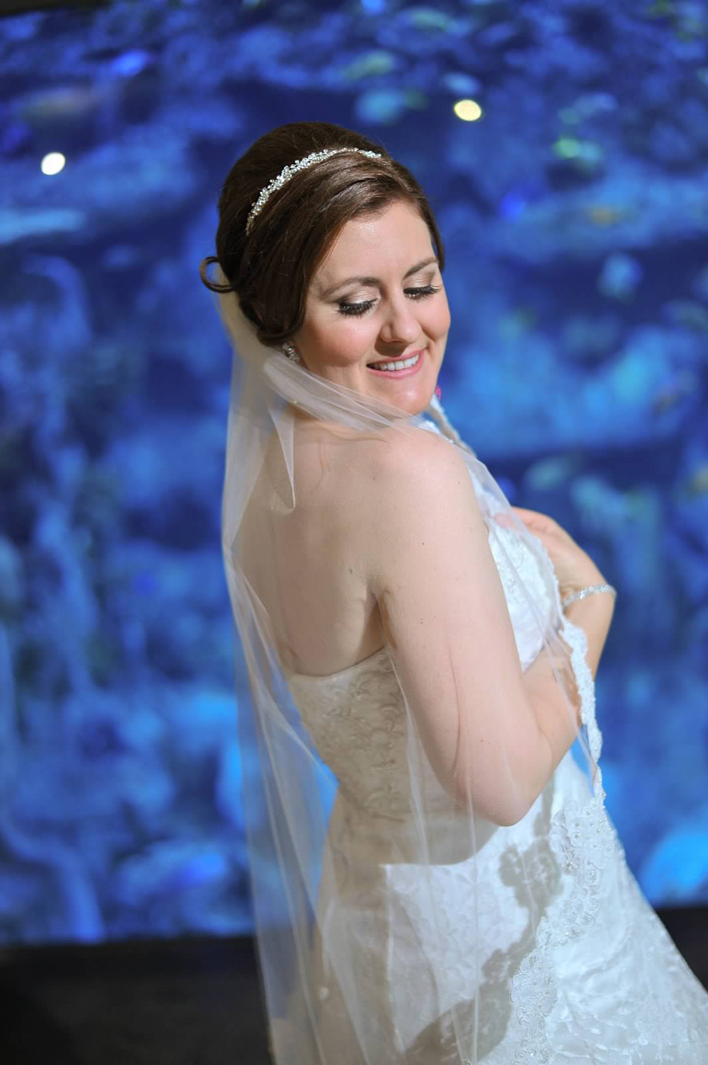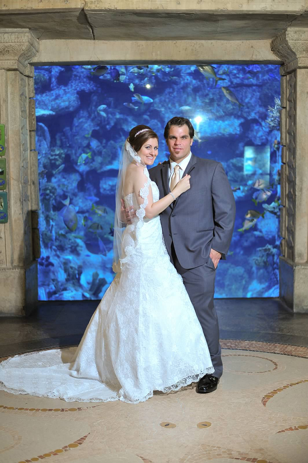 Are you ready to go under the sea? That’s where Kari and Drew’s wedding today takes us, to the exquisite Seascape Ballroom inside Mandalay Bay’s Shark Reef Aquarium. Small wedding ceremonies have been possible in the aquarium for a while, but recently a reception space has been made available, as well. Not only do the venue (and couple) look stunning, the theme chosen fits their destination wedding so well!