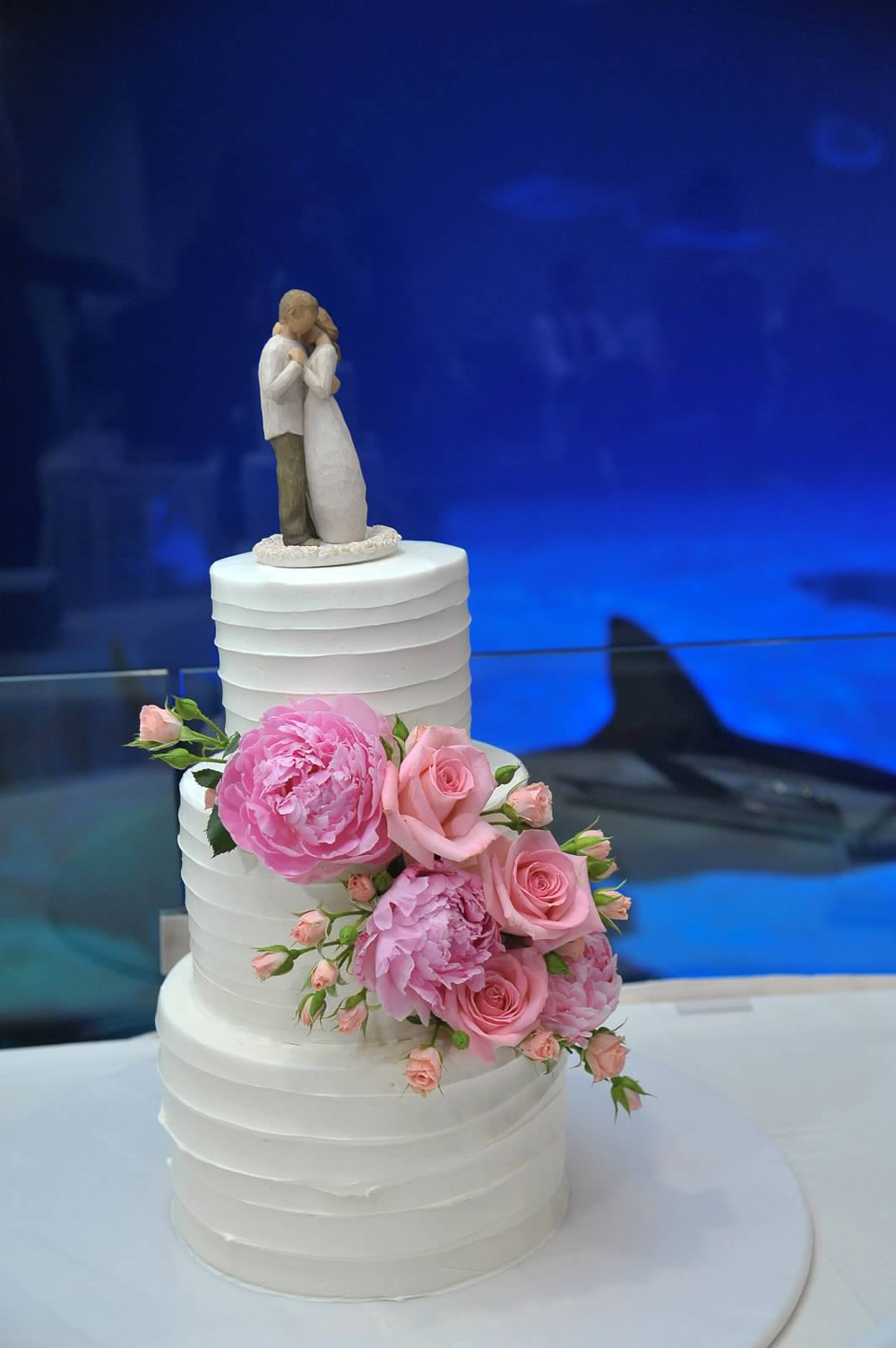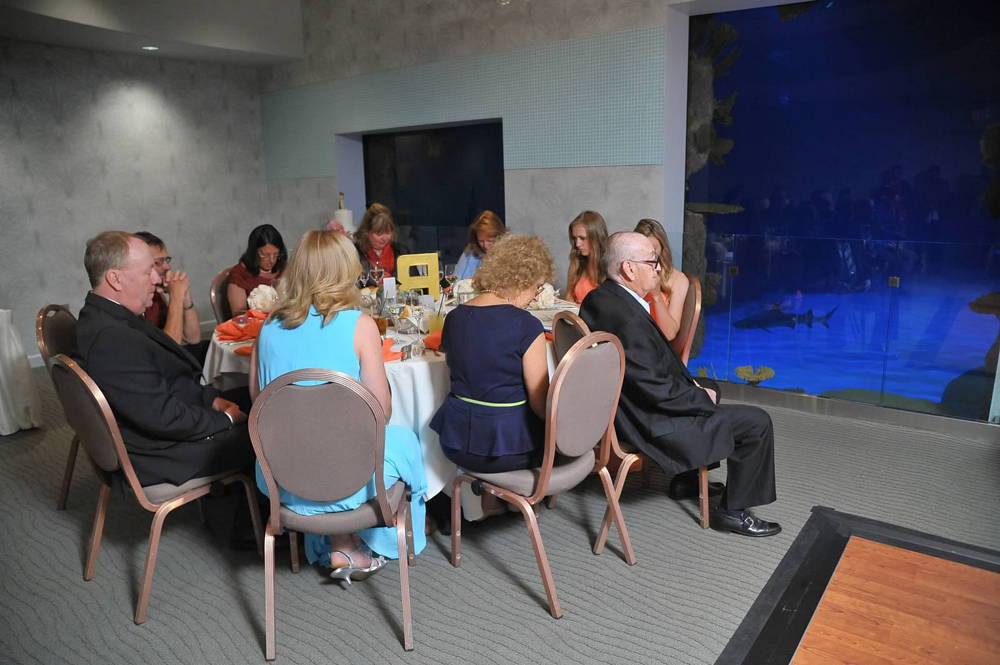 All of our guests were escorted through the Shark Reef to the ballroom right after the ceremony. The space had curtains covering the glass to the aquariums, so it looked like there were plain walls. During our first dance to “Octopus’s Garden” by The Beatles, the curtains were slowly raised to reveal the hidden windows looking into the sunken ship inside the Shark Reef.