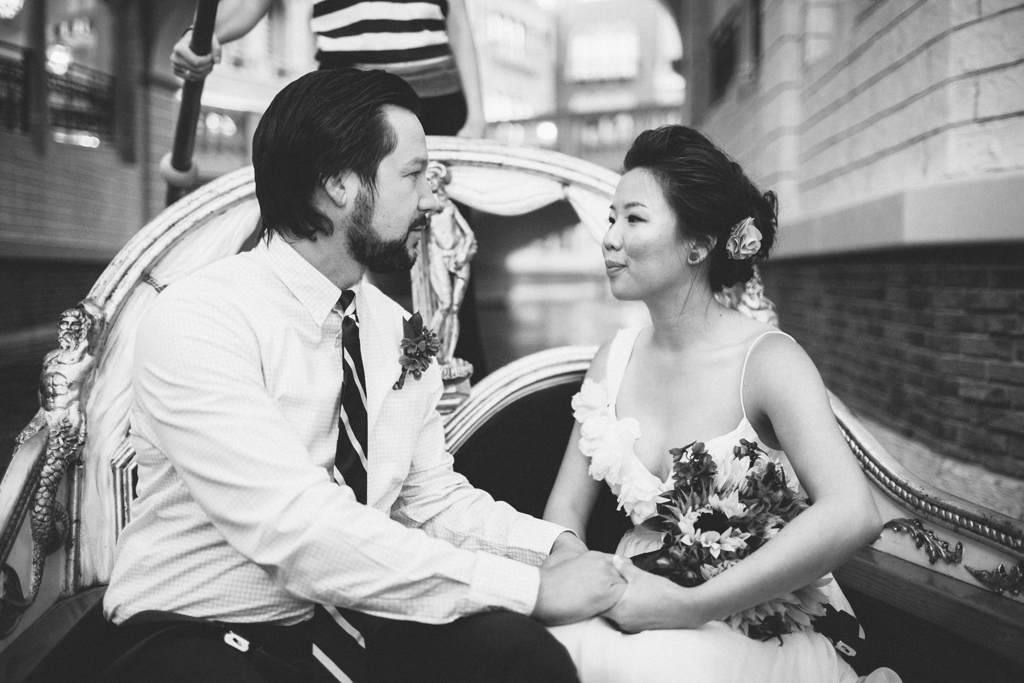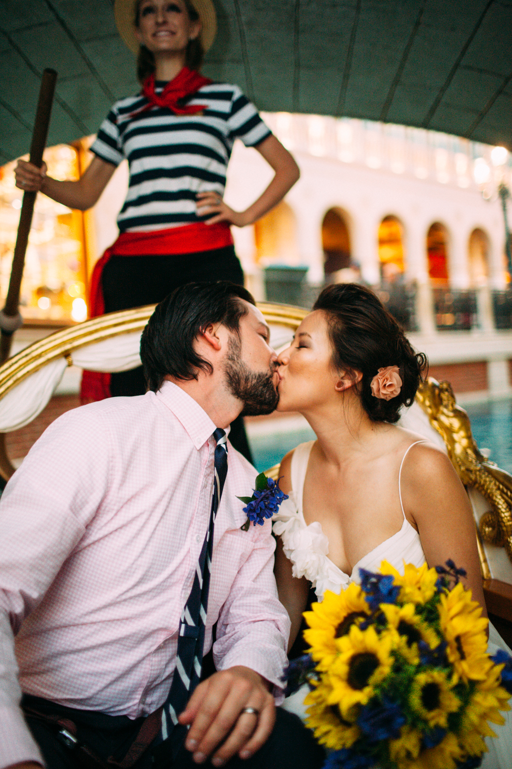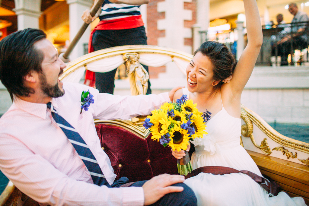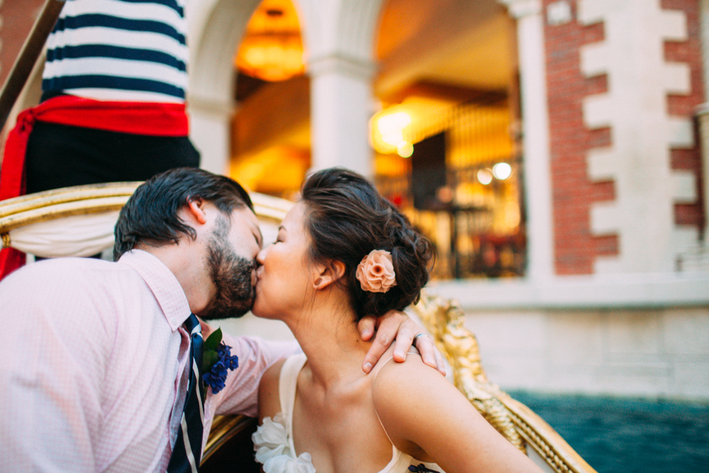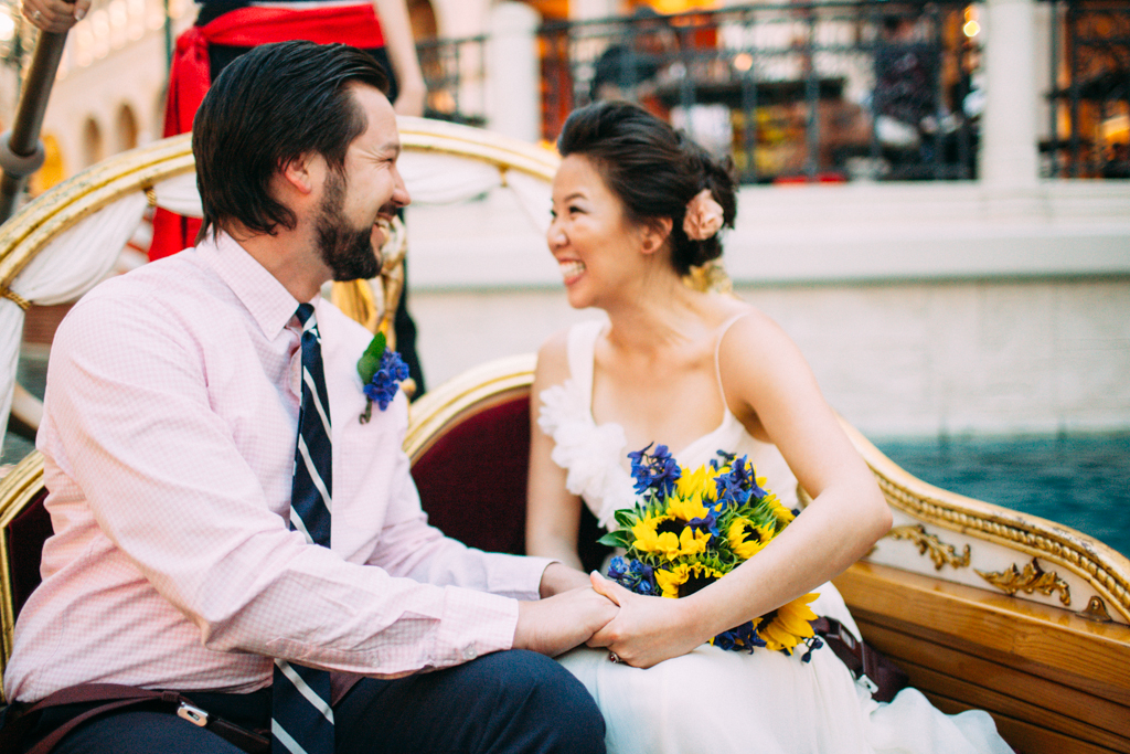 I always feel like I’m spying in on a couple when I feature an elopement on Little Vegas Wedding. It’s so…private and intimate! Hanna and James chose to do their ceremony Vegas-style, and got married on a gondola floating down the replica canal of Venetian Las Vegas.