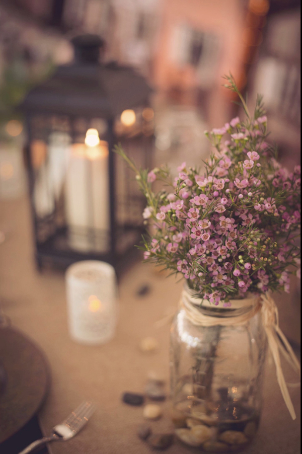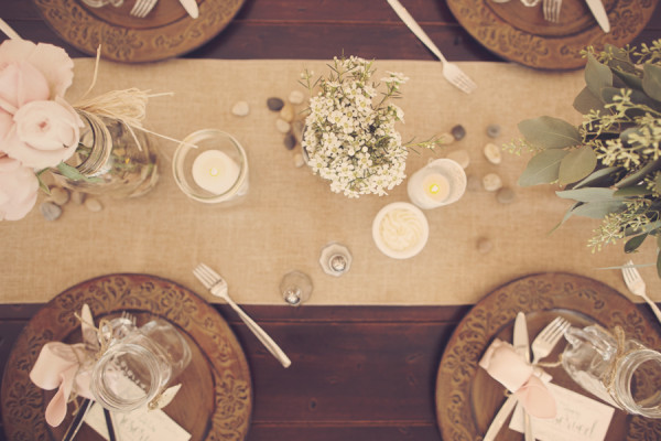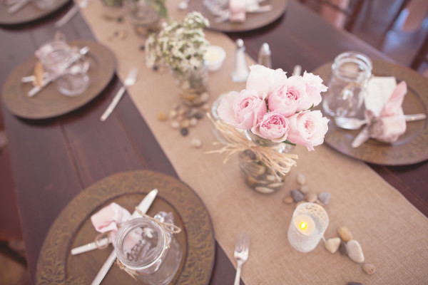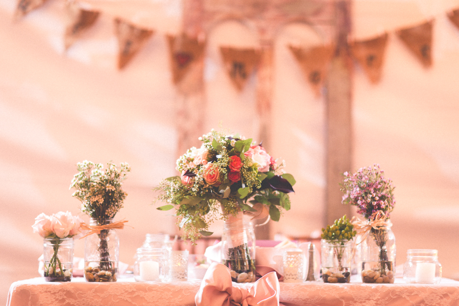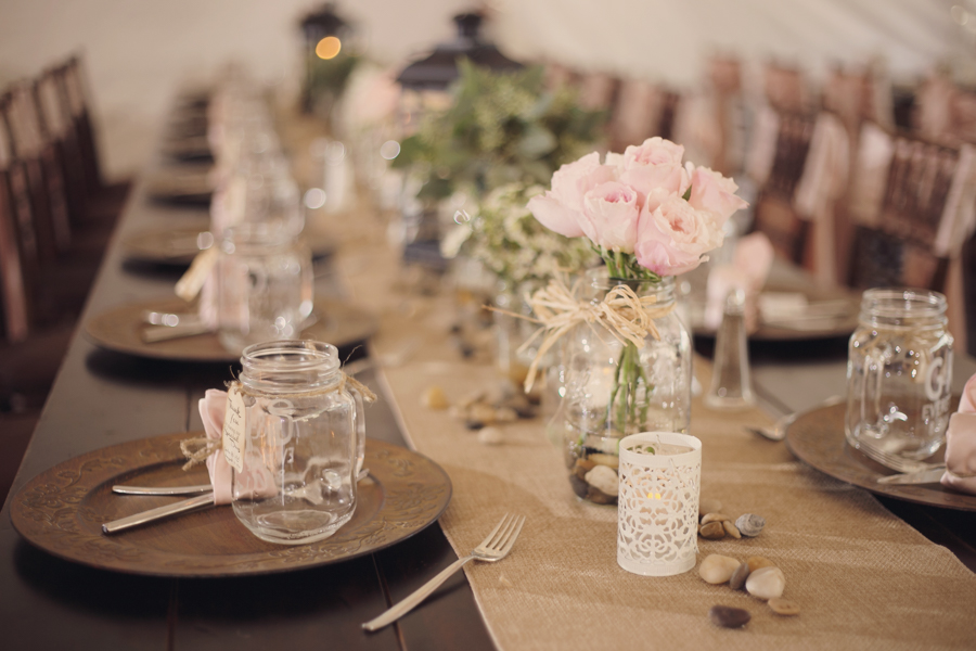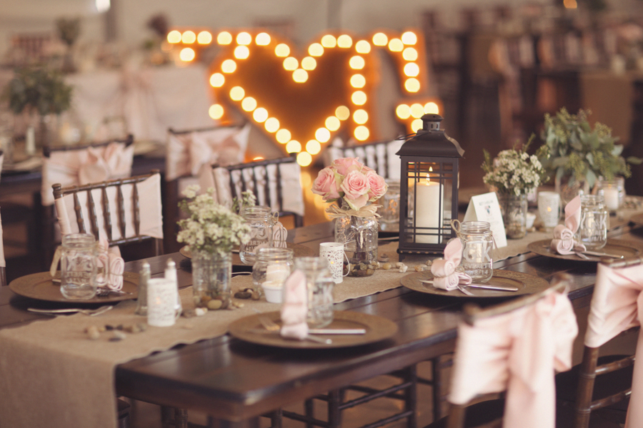 I wanted to go with a romantic rustic theme. Being that the wedding was in the midst of summer and we were outdoors, I wanted to keep the colors cooler. We chose to do a blush pink rustic theme with an eggplant accent. We had an arch outside covered in flowers right under their huge oak tree where the ceremony took place. The reception was AMAZING! The flowers were perfect. They were so romantic. I only spoke with Dani, the florist, over the phone once about the flowers and she hit the nail right on the head! I told her what my vision and theme were and she made it into such a fairytale. I chose to go with the darker wood for the tables and chairs so that it would help the blush pinks pop and it was beautiful. From the table settings, to the glass dispensers, everything was just so simple and romantic.