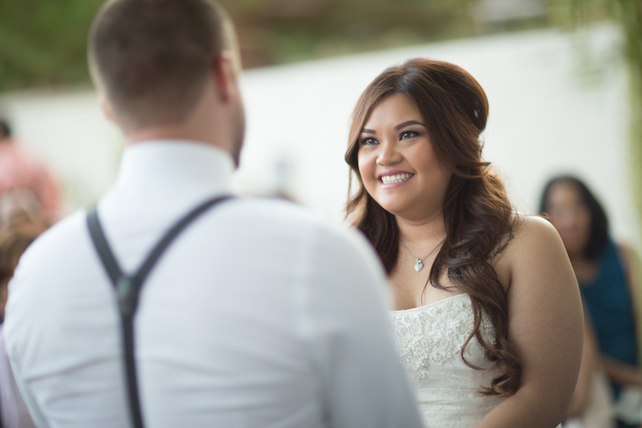 My favorite memory, as cliché as it sounds, was when Kiel first looked at me walking down the aisle. As soon as our eyes met, it was waterworks! There was actually one thing that happened that stood out to me because I thought it was so funny! I was waiting in the room for them to tell me it was ok to come out and walk down the aisle. Maybe five minutes before, Kiel’s mom comes in to tell me the DJ wasn’t there, but they had the situation under control. So, I took it as it was and since it was “under control†I didn’t let it stress me out. As I’m walking down the aisle, I see the DJ in his makeshift booth and I hear the music playing. It was only after everyone was seated and eating that they told me the DJ thought the wedding was the next day! He arrived 5 minutes before the ceremony started and had the catering crew helping him set up the sound system! Needless to say, everything was smooth sailing from there and everyone had a great night!