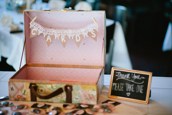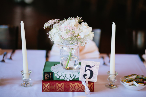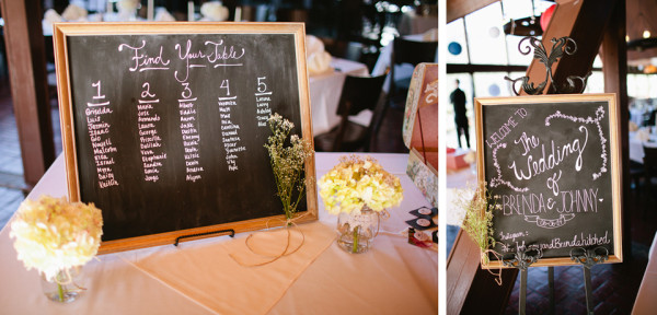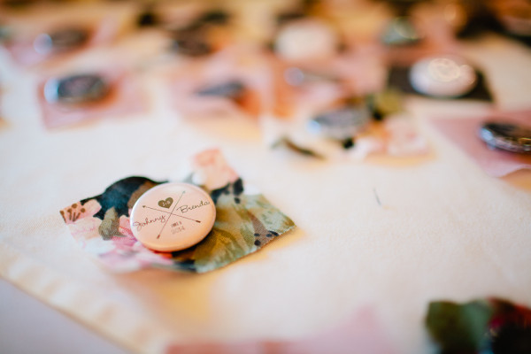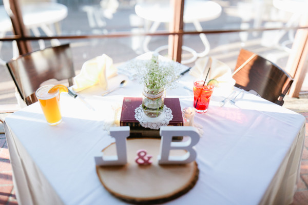 I pretty much made all the decorations and centerpieces myself! My sister and I made all the signs and seating charts out of old picture frames. I spray painted them with chalk board paint, and she hand wrote everything. I bought mason jars and my husband and I made the flower arrangements inside, they were placed on top of vintage books I found at different thrift stores. I made the table numbers from the pages of the books. Our sweetheart table had a monogramed wooden slice, which my husband and I painted and put together. Our personalized button favors were made by a friend and our invitations were hand made by Mariah who I found on Pinterest.