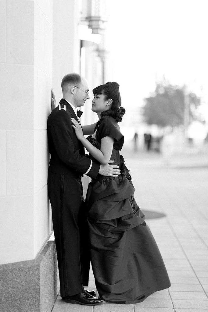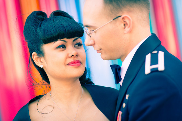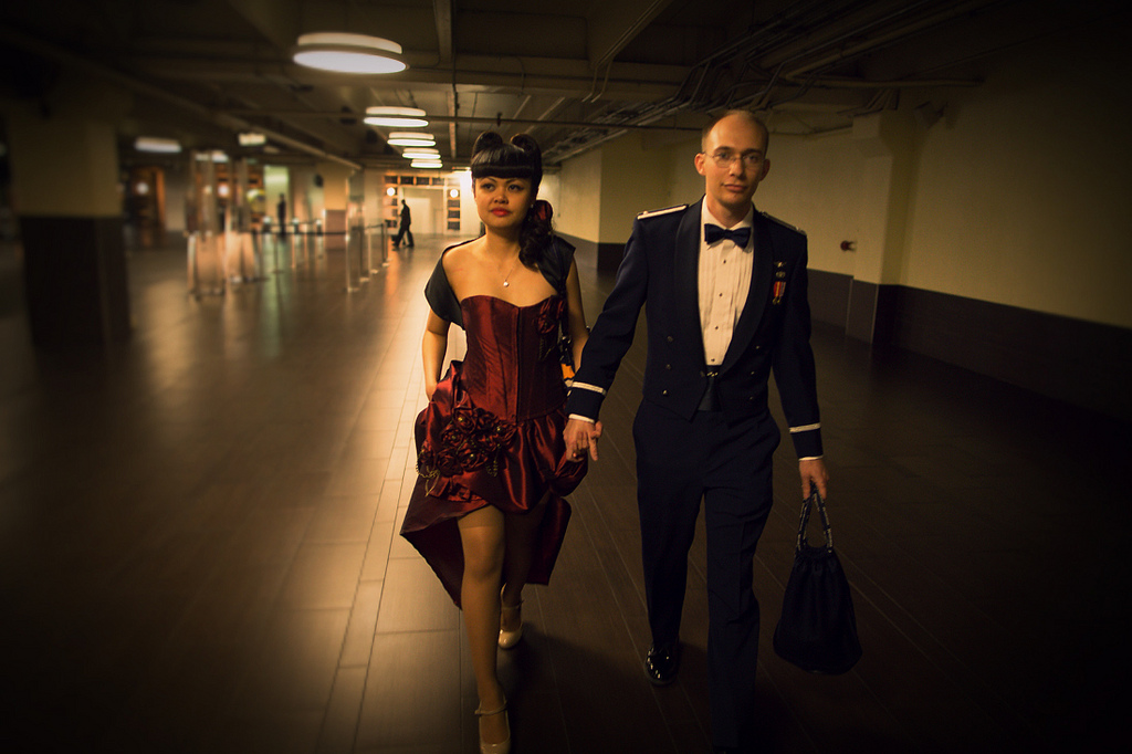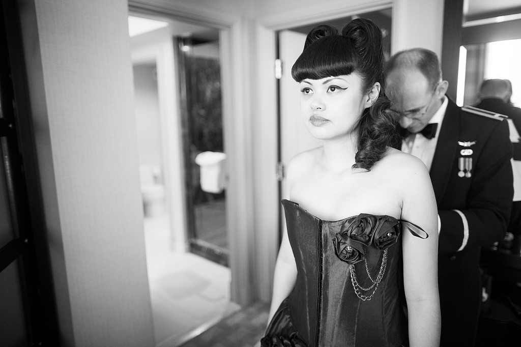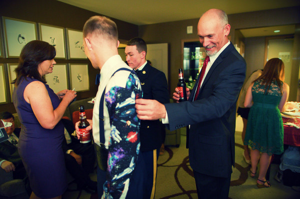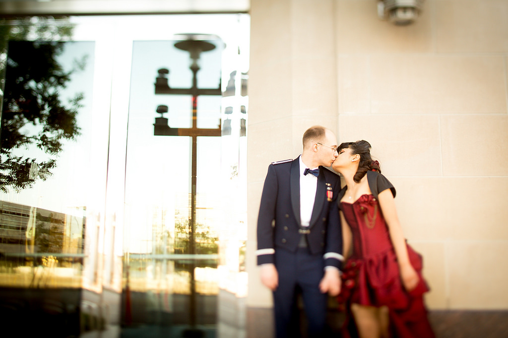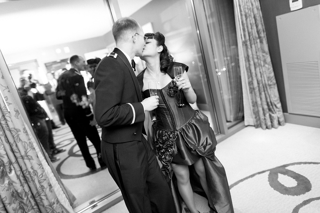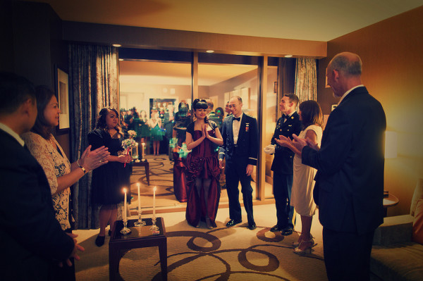 Also Jessica, the bride, wore an incredible Victorian-style corseted gown with a victory roll hairstyle. Since both she and her husband are gamers, so there was a Portal and Mass Effect themed wedding cake and an amazing space-themed shirt for the groom, Michael. Their military wedding followed by cake and Champagne reception were casual and intimate, and brought all the best elements of family and love together.