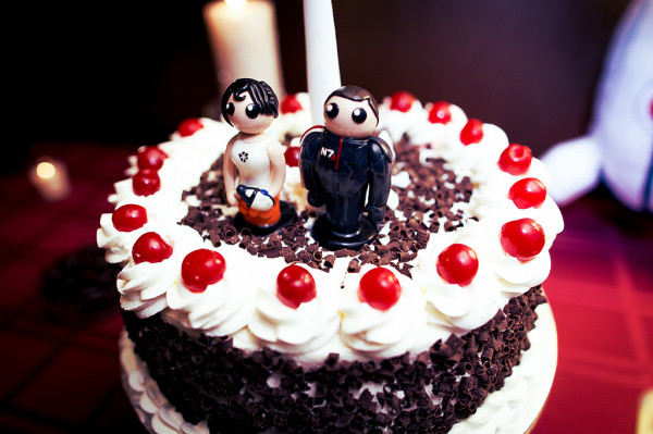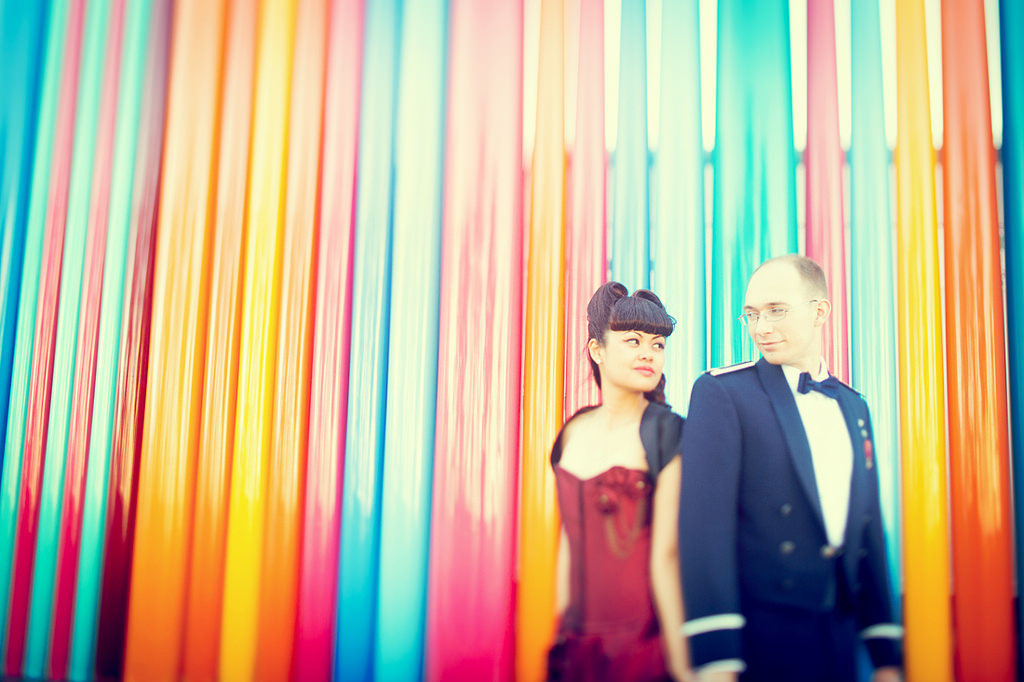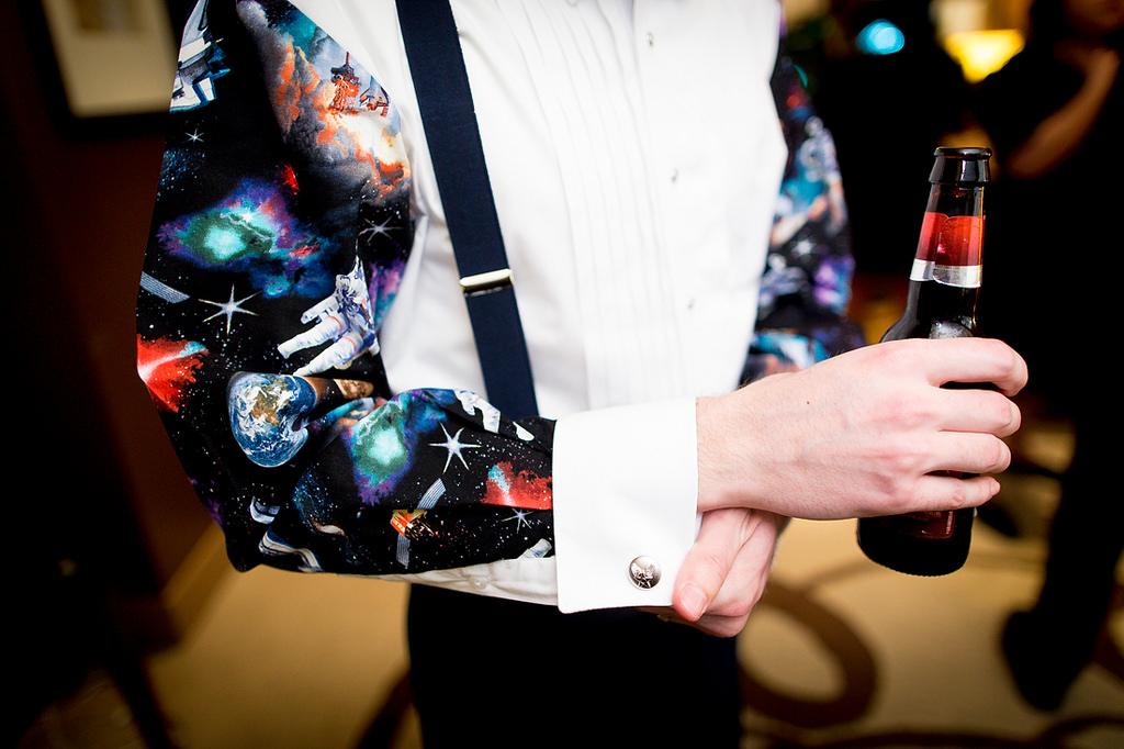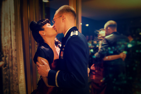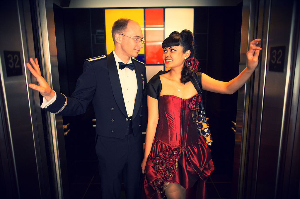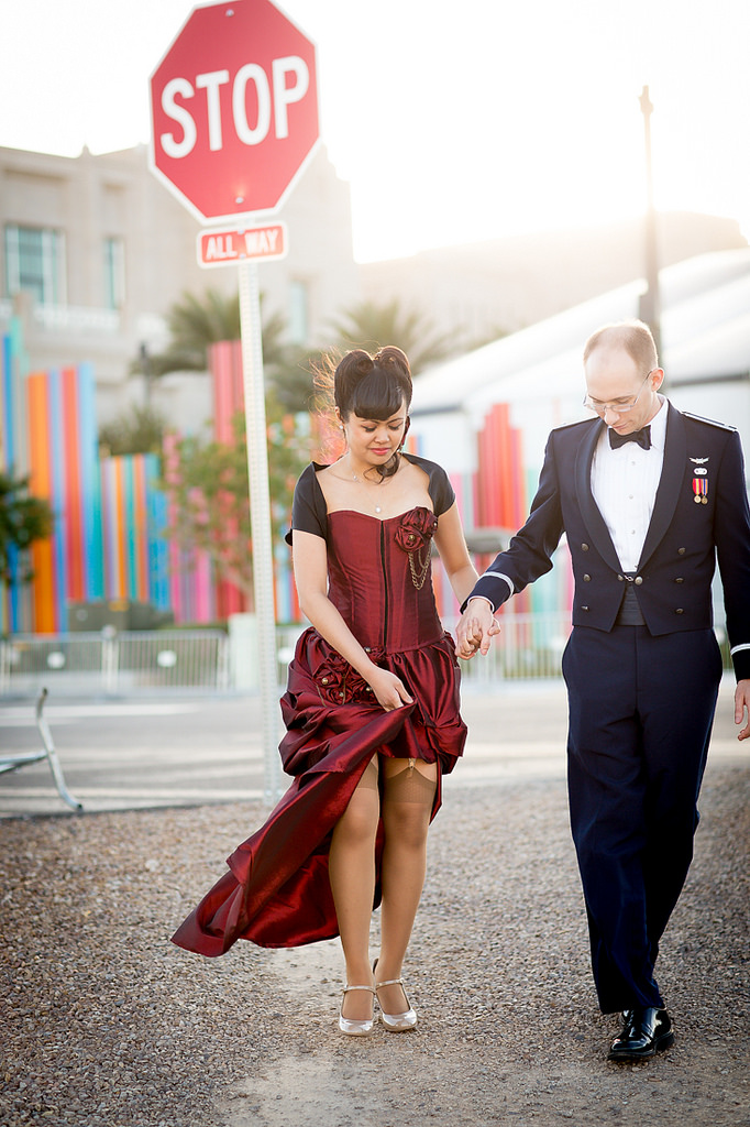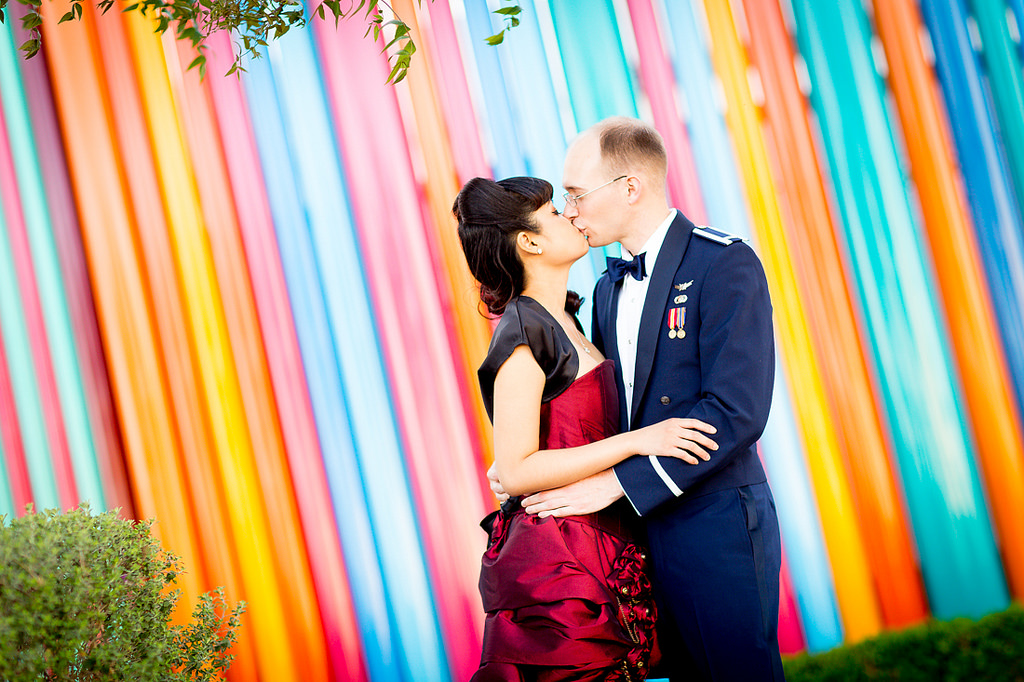 Also Jessica, the bride, wore an incredible Victorian-style corseted gown with a victory roll hairstyle. Since both she and her husband are gamers, so there was a Portal and Mass Effect themed wedding cake and an amazing space-themed shirt for the groom, Michael. Their military wedding followed by cake and Champagne reception were casual and intimate, and brought all the best elements of family and love together.